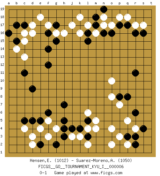 Last move : 0-1 2008 September 12 21:40:44 [Event "FICGS__GO__TOURNAMENT_KYU_I__000006"] [Site "FICGS"] [Date "2008.04.24"] [Round "1"] [Black "Hensen,Erik"] [White "Suarez-Moreno,Alejandro"] [Result "0-1"] [Rating 1 "1012"] [Rating 2 "1050"] 1.r16 d16 2.q3 d3 3.p17 q5 4.q8 o4 5.j4 g4 6.l3 o2 7.r11 q2 8.c5 c4 9.d5 c13 10.d9 k3 11.h5 j3 12.l5 l4 13.f16 h16 14.r3 r4 15.r6 m16 16.s4 p3 17.r2 m5 18.c17 d17 19.f14 f17 20.k17 k16 21.k4 m4 22.m18 o17 23.f12 p18 24.q17 q18 25.o16 n17 26.h3 l2 27.g17 j17 28.b15 c15 29.h4 e4 30.b17 b14 31.c11 e18 32.l16 l17 33.l15 g16 34.m17 k18 35.n16 n18 36.e5 f5 37.f6 l6 38.e2 f3 39.g15 p7 40.p8 o8 41.h7 o10 42.n19 s17 43.s16 r17 44.g2 d2 45.a16 c16 0-1 This go game has been lost on time (started : 2008.04.24 19:48:31) Here are the names of the openings (joseki) played in the four corners : Corner q4 : q3 q5 Komoku (Somok, Xiao~mu`) 3-4 Point. The komoku (3-4) point is the traditional corner enclosure move.. Ikken Takagakari (Hankan Nop'dakeolch'im, Yi Gaogua`jiao~, 1-Space High Approach). The 5-4 approach move has become more popular in modern times, as modern Go emphasizes speed and influence. Corner d4 : d3 j4 Komoku (Somok, Xiao~mu`) 3-4 Point. The komoku (3-4) point is the traditional corner enclosure move.. Player White won this Go (weiqi, baduk) game. Follow this game move after move (download)Use a wall to attack, not to make territory. (Anonymous) Unless I accept my faults I will most certainly doubt my virtues. (Hugh Prather)