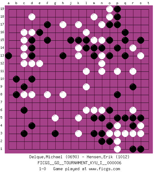 Last move : 1-0 2008 September 6 20:48:12 [Event "FICGS__GO__TOURNAMENT_KYU_I__000006"] [Site "FICGS"] [Date "2008.04.24"] [Round "1"] [Black "Delque,Michael"] [White "Hensen,Erik"] [Result "1-0"] [Rating 1 "0690"] [Rating 2 "1012"] 1.d4 q3 2.q16 d16 3.q5 o3 4.p8 n17 5.p17 k17 6.q13 r11 7.r9 p11 8.o13 n11 9.m13 s13 10.s15 l11 11.d10 k3 12.m3 r14 13.q15 l9 14.m5 k5 15.o6 s3 16.s5 c12 17.b10 c8 18.c9 d8 19.c6 f8 20.b8 h8 21.f17 h17 22.f15 d18 23.d14 o18 24.p18 c14 25.d15 c15 26.e16 c16 27.g3 n15 28.p14 l6 29.j15 e12 30.d13 d12 31.l15 k13 32.l14 k14 33.k15 n13 34.n14 n12 35.h13 l16 36.a13 c13 37.c3 g5 38.o17 o19 39.p19 m18 40.o15 r6 41.r5 m15 42.m14 n6 43.n5 o5 44.o4 p4 45.p5 m6 46.n3 p3 47.o2 p2 48.n2 s4 49.r4 r3 50.r1 p1 51.s1 1-0 This go game has been lost on time (started : 2008.04.24 19:48:31) Here are the names of the openings (joseki) played in the four corners : Corner q4 : q3 q5 Komoku (Somok, Xiao~mu`) 3-4 Point. The komoku (3-4) point is the traditional corner enclosure move.. Ikken Takagakari (Hankan Nop'dakeolch'im, Yi Gaogua`jiao~, 1-Space High Approach). The 5-4 approach move has become more popular in modern times, as modern Go emphasizes speed and influence. Corner q16 : q16 n17 Hoshi (Hwajeom, Seongjeom, Xingwei`) 4-4 Point. The star or hoshi (4-4) point, emphasizing influence at the potential expense of territory. Nikken Kakari (Dukan Keolch'im, E`r Gua`jiao~, 2-Space Low Approach). Black typically answers by 7-3 or 3-5 (which is not joseki). Corner d4 : d4 c8 Hoshi (Hwajeom, Seongjeom, Xingwei`) 4-4 Point. The star or hoshi (4-4) point, emphasizing influence at the potential expense of territory. Player Black won this Go (weiqi, baduk) game. Follow this game move after move (download)Keep inessential ataris till the end. (Anonymous) Secret operations are essential in war; upon them the army relies to make its every move. (Sun Tzu)