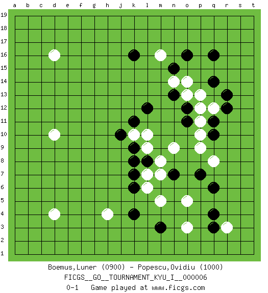Last move : 0-1 2008 July 22 15:50:7 [Event "FICGS__GO__TOURNAMENT_KYU_I__000006"] [Site "FICGS"] [Date "2008.04.24"] [Round "1"] [Black "Boemus,Luner"] [White "Popescu,Ovidiu"] [Result "0-1"] [Rating 1 "0900"] [Rating 2 "1000"] 1.q16 d4 2.q4 d16 3.q10 d10 4.k4 o3 5.k16 h4 6.m3 o5 7.q6 r3 8.q3 q8 9.p7 p9 10.n7 m5 11.k6 l6 12.k7 l7 13.k9 l9 14.l8 m8 15.k8 m7 16.k11 l10 17.l12 k10 18.j10 n9 19.o11 p10 20.q11 p11 21.o12 q12 22.r12 p12 23.r13 o13 24.n13 o14 25.q14 p13 26.o16 m16 27.n15 n14 0-1 This go game has been lost on time (started : 2008.04.24 19:48:31) Here are the names of the openings (joseki) played in the four corners : Corner q4 : q4 o3 Hoshi (Hwajeom, Seongjeom, Xingwei`) 4-4 Point. The star or hoshi (4-4) point, emphasizing influence at the potential expense of territory. Ikken Kakari (Hankan Keolch'im, Yi Gua`jiao~, 1-Space Low Approach). White 2 is the standard approach move to the 4-4. Player White won this Go (weiqi, baduk) game. Follow this game move after move (download)The strong player plays straight, the weak diagonally. (Anonymous) Patience, use the Force, think ! (Obi-Wan Kenobi in Star Wars ep.2)