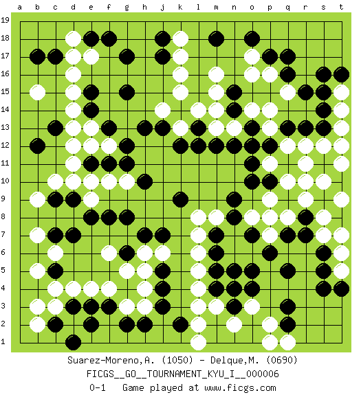 Last move : 0-1 2008 September 4 1:51:1 [Event "FICGS__GO__TOURNAMENT_KYU_I__000006"] [Site "FICGS"] [Date "2008.04.24"] [Round "1"] [Black "Suarez-Moreno,Alejandro"] [White "Delque,Michael"] [Result "0-1"] [Rating 1 "1050"] [Rating 2 "0690"] 1.q16 d4 2.q3 d16 3.q5 d10 4.e3 e4 5.d3 c3 6.f3 k16 7.c2 b3 8.q13 l3 9.j3 o3 10.o5 l5 11.m4 l4 12.n3 m3 13.o4 n2 14.n4 r9 15.d7 f4 16.g4 g3 17.g2 h3 18.h2 h4 19.j4 h5 20.g6 g5 21.c5 d2 22.e2 c4 23.c9 c10 24.d9 e9 25.e8 e10 26.q9 r10 27.r8 s8 28.r7 s12 29.s13 r12 30.r13 s7 31.s6 b5 32.g8 o17 33.p17 o16 34.g17 e17 35.g15 e13 36.j17 k17 37.h13 p2 38.q2 q8 39.q7 p8 40.p10 p9 41.q11 q10 42.o10 p16 43.q17 p14 44.m18 m16 45.o18 q15 46.r15 k18 47.h10 k13 48.e14 d14 49.e15 d15 50.k14 l14 51.l13 j14 52.j13 k15 53.k12 m13 54.l12 b9 55.c7 b7 56.f13 e12 57.b17 b15 58.e18 d18 59.f18 c6 60.j5 l2 61.n14 n13 62.o13 o14 63.n12 m14 64.m12 l8 65.n8 n7 66.o7 m8 67.m7 l7 68.m6 l6 69.j7 f6 70.f8 p7 71.p6 n6 72.m5 o8 73.n9 o6 74.s11 r11 75.t12 s10 76.t10 t9 77.n5 t11 78.o7 p1 79.j18 p13 80.o12 p11 81.p12 q12 82.o11 t13 83.s15 t15 84.t16 t14 85.s14 t12 86.s16 t6 87.s5 t5 88.t4 t7 89.s4 q1 90.f11 b2 91.d1 h6 92.h7 f12 93.e11 d11 94.k9 g10 95.g11 f10 96.g12 j6 97.k2 l1 98.b12 d12 99.c13 d13 100.c17 d17 101.n15 m15 0-1 Here are the names of the openings (joseki) played in the four corners : Corner d4 : d4 e3 Hoshi (Hwajeom, Seongjeom, Xingwei`) 4-4 Point. The star or hoshi (4-4) point, emphasizing influence at the potential expense of territory. Corner d16 : d16 g17 Hoshi (Hwajeom, Seongjeom, Xingwei`) 4-4 Point. The star or hoshi (4-4) point, emphasizing influence at the potential expense of territory. Nikken Kakari (Dukan Keolch'im, E`r Gua`jiao~, 2-Space Low Approach). White typically answers by 7-3 or 3-5 (which is not joseki). Player White won this Go (weiqi, baduk) game. Follow this game move after move (download)Go is essentially a form of harmony. Go in the 21st century will have to be go of the 'harmony of the six points - the four quarters, the above and the below.' As in life we will need to view the whole rather than the part. Japanese go has focused too heavily on the local (joseki) rather than the whole for 300 years. The reason the Chinese and Koreans are overtaking the Japanese is that they are closer to achieve this whole-board view. (Go Seigen, 9p, 1994) The intuitive mind is a sacred gift; the rational mind is a faithful servant. We have created a society that honors the servant but has forgotten the gift. (Albert Einstein)
