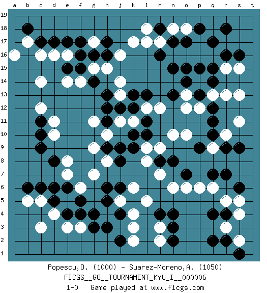 Last move : 1-0 2008 September 14 7:56:31 [Event "FICGS__GO__TOURNAMENT_KYU_I__000006"] [Site "FICGS"] [Date "2008.04.24"] [Round "1"] [Black "Popescu,Ovidiu"] [White "Suarez-Moreno,Alejandro"] [Result "1-0"] [Rating 1 "1000"] [Rating 2 "1050"] 1.r16 e16 2.q4 d4 3.c17 c16 4.d17 d16 5.e17 b17 6.f16 e14 7.c10 d11 8.c11 d10 9.c6 c5 10.d6 h4 11.f4 f3 12.g3 e3 13.g4 k4 14.n4 m3 15.n3 c12 16.c9 p17 17.q17 p16 18.q14 g17 19.f17 k17 20.h16 j16 21.h17 g15 22.g16 h15 23.k10 r13 24.r7 s15 25.s16 r15 26.p18 o18 27.r18 q16 28.q15 s11 29.s9 e5 30.h5 j5 31.h6 o13 32.o14 p14 33.p15 q13 34.p13 p12 35.n13 o12 36.n15 n16 37.n17 o16 38.m16 m17 39.m18 l17 40.o15 n18 41.o17 l18 42.b18 a16 43.f15 f14 44.e15 c14 45.g14 j14 46.h13 j13 47.h12 f6 48.h3 k3 49.j2 k2 50.j6 k6 51.j4 l5 52.m4 m2 53.n2 r3 54.r2 s2 55.q2 s5 56.r4 s4 57.s6 r5 58.s1 q6 59.q7 p6 60.q11 r10 61.q10 o10 62.q12 q9 63.p9 s13 64.r9 n6 65.o7 o6 66.m8 m7 67.n8 e8 68.d8 e7 69.e6 g7 70.d5 b5 71.b6 c3 72.e4 j11 73.j12 h10 74.k12 k11 75.l11 l12 76.l13 m12 77.k13 l9 78.l10 m9 79.k9 l8 80.j8 h8 81.f5 n10 82.h9 g9 83.j9 g11 84.h11 1-0 Here are the names of the openings (joseki) played in the four corners : Corner d16 : e16 c17 Takamoku (Gomok, Gaomu`) 5-4 Point. The takamoku (high) point (5-4). With its emphasis on influence, the 5-4 point complements the 4-4 (hoshi) point in creating an influence-oriented fuseki. San-san. Black plays the 3-3 when White has a stone at top such as marked. Corner d4 : d4 c6 Hoshi (Hwajeom, Seongjeom, Xingwei`) 4-4 Point. The star or hoshi (4-4) point, emphasizing influence at the potential expense of territory. Ikken Kakari (Hankan Keolch'im, Yi Gua`jiao~, 1-Space Low Approach). Black 2 is the standard approach move to the 4-4. Corner q16 : r16 p17 Komoku (Somok, Xiao~mu`) 3-4 Point. The komoku (3-4) point is the traditional corner enclosure move.. Ikken Kakari (Hankan Keolch'im, Yi Gua`jiao~, 1-Space Low Pincer). The small knight move is the basic approach move to the 3-4 point stone. It has been continually used for over four centuries. There are limitless variations, with new moves constantly being discovered. White 2 opens the door to a treaure store of joseki. Player Black won this Go (weiqi, baduk) game. Follow this game move after move (download)Don't disturb symmetry. (Anonymous) A proverb is a short sentence based on long experience. (Miguel de Cervantes)