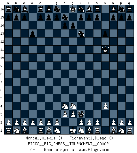 Last move : 0-1 2008 May 3 8:16:51 [Event "FICGS__BIG_CHESS__TOURNAMENT__000021"] [Site "FICGS"] [Date "2008.04.27"] [Round "1"] [White "Marcel,Alexis"] [Black "Fioravanti,Diego"] [Result "0-1"] [WhiteElo ""] [BlackElo ""] 1.j2-h4 j15-k13 2.h1-k3 n15-n13 3.h2-j4 d15-d13 4.n2-n4 h16-n11 0-1 Follow this game move after move (download)Castle early and often. (Rob Sillars) Je mehr wir mit Computern analysieren, desto mehr glauben wir an Verteidigung. (Vladimir Kramnik) Personalmente, yo prefiero mirar hacia el futuro en donde un programa de computadora gane el título mundial de Ajedrez. La humanidad necesita una lección de humildad. (Richard Dawkings) Un journaliste : 'Vous préférez avoir une dame de plus sur l'échiquier ou au lit ?' Boris Spassky : 'Ca dépend de la position.' CHESS, n. f. [echecs, Fr.] A nice and abstruse game, in which two sets of puppets are moved in opposition to each other. (Dr Samuel Johnson, A Dictionary Of The English Language, 1755)