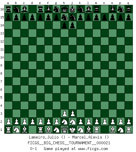Last move : 0-1 2008 May 27 10:49:12 [Event "FICGS__BIG_CHESS__TOURNAMENT__000021"] [Site "FICGS"] [Date "2008.04.27"] [Round "1"] [White "Lameiro,Julio"] [Black "Marcel,Alexis"] [Result "0-1"] [WhiteElo ""] [BlackElo ""] 0-1 This big chess game has been lost on time (started : 2008.04.27 2:26:22) Follow this game move after move (download)In Chess, at least, the brave inherit the earth. (Edmar Mednis) Man gibt nur Pakete auf. (Paul Keres) Aquellos que dicen que entienden al Ajedrez, no entienden nada. (Robert Hubner) Les sacrifices démontrent seulement que quelqu'un a gaffé. (Savielly Tartacover) The human is the only animal species whose members are able to talk themselves into difficulties that would not otherwise exist. (Wendell Johnson)