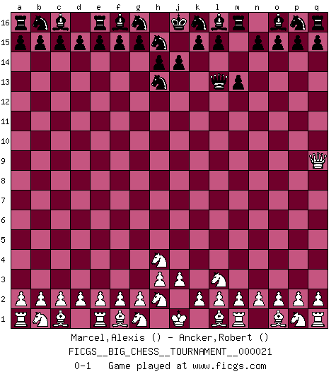 Last move : 0-1 2008 May 7 8:4:48 [Event "FICGS__BIG_CHESS__TOURNAMENT__000021"] [Site "FICGS"] [Date "2008.04.27"] [Round "1"] [White "Marcel,Alexis"] [Black "Ancker,Robert"] [Result "0-1"] [WhiteElo ""] [BlackElo ""] 1.j2-h4 j15-h13 2.h1-q9 h16-l13 3.k1-l3 m15-m13 0-1 Follow this game move after move (download)Fischer was a master of clarity and a king of artful positioning. His opponents would see where he was going but were powerless to stop him. (Bruce Pandolfini) Ihnen, Herr Lasker, habe ich nur drei Worte zu sagen: Schach und matt. (Siegbert Tarrasch) Ser exitoso en el Ajedrez te permite descubrir tu propia personalidad. Eso es lo que deseo para los niños de mi clase. (Saudin Robovic) On n'a jamais que l'âge auquel on a commence à jouer aux échecs car après on cesse de vieillir. (Capablanca) You must do what you feel is right... of course. (Obi-Wan Kenobi in Star Wars ep.4)