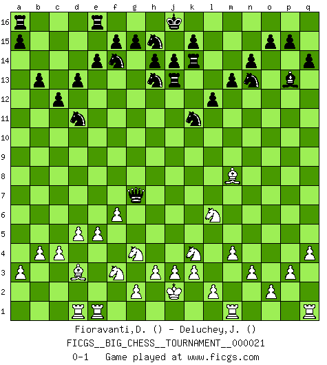 Last move : 0-1 2008 September 23 18:57:35 [Event "FICGS__BIG_CHESS__TOURNAMENT__000021"] [Site "FICGS"] [Date "2008.04.27"] [Round "1"] [White "Fioravanti,Diego"] [Black "Deluchey,Jean-Philippe"] [Result "0-1"] [WhiteElo ""] [BlackElo ""] 1.j2-k4 j15-h13 2.h2-g4 n15-n14 3.d2-d4 h16-o10 4.p1-o3 d15-d13 5.h1-l4 k16-l14 6.c1-h6 c16-j10 7.e2-e4 j10-e6 8.h6-j5 o10-a10 9.f1-e2 e15-e14 10.m2-m4 c15-c13 11.l1-p5 m15-m13 12.b1-c3 l16-m15 13.p2-p3 o16-m14 14.o1-p2 m16-l16 15.k1-h2 l14-j13 16.f2-f4 m14-n13 17.a1-d1 b16-c14 18.f4-f5 e6-b9 19.g1-f3 f16-d14 20.o3-n5 l15-l13 21.a2-a3 l13-l12 22.c3-d5 g16-f14 23.e2-d3 c13-c12 24.g4-e3 b9-d11 25.l4-n6 n13-o14 26.n2-n3 b15-b13 27.e4-e5 m15-h11 28.n6-h6 p16-n15 29.f5-f6 h11-g10 30.d3-j8 g10-j8 31.p2-j8 n15-l14 32.d5-e7 q15-q14 33.j8-f5 a10-b10 34.e3-c4 d14-b12 35.h6-h4 b12-j5 36.h4-j5 c14-e13 37.b2-b4 o14-n15 38.e7-c8 b10-c10 39.c8-e9 c10-c4 40.e9-d11 e13-d11 41.j1-j2 l14-n13 42.f5-d3 c4-g8 43.q2-q4 l16-l14 44.h2-g4 l14-k14 45.n5-l6 n15-p13 46.c2-c4 q16-l16 47.d4-d5 l16-l13 48.k2-k3 j13-k11 49.p5-m8 l13-j13 50.j5-g7 g8-g7 0-1 Follow this game move after move (download)The most important feature of the Chess position is the activity of the pieces. This is absolutely fundamental in all phases of the game: Opening, Middlegame and especially Endgame. The primary constraint on a piece's activity is the Pawn structure. (Michael Stean) Intelligenz läßt sich nicht am Weg, sondern nur am Ergebnis feststellen. (Garry Kasparov) Las piezas de Ajedrez son los bloques del alfabeto que moldean los pensamientos; y esos pensamientos, aunque hagan un diseño visual en el tablero, expresan abstractamente su belleza como un poema. (Marcel Duchamp) Un millionnaire : 'Monsieur Steinitz ! Vous ne participez aux tournois que pour l'argent, alors que moi je n'y viens que pour l'honneur.' Steinitz : 'Chacun joue pour ce qu'il n'a pas'... There are two kinds of people in the world, my friend. Those who have a loaded gun and those who dig. You dig ! (Blondie in The Good, The Bad and The Ugly)