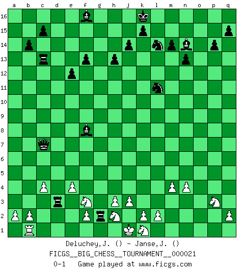 Last move : 0-1 2008 May 9 19:2:17 [Event "FICGS__BIG_CHESS__TOURNAMENT__000021"] [Site "FICGS"] [Date "2008.04.27"] [Round "1"] [White "Deluchey,Jean-Philippe"] [Black "Janse,Japie"] [Result "0-1"] [WhiteElo ""] [BlackElo ""] 1.j2-h4 j15-k13 2.h1-o7 h14-h13 3.o7-o15 p16-o14 4.o15-c4 b16-c14 5.n2-n3 b15-b14 6.o1-f9 g16-h14 7.e2-e4 e15-e13 8.f1-e2 n15-n14 9.e2-n10 k13-l11 10.n10-k7 c16-b15 11.f9-b13 e13-e12 12.e1-e3 e16-e13 13.e3-b3 f15-f13 14.d2-d3 e13-c13 15.c4-d4 o16-k12 16.c2-c4 a15-a14 17.b13-c14 b15-c14 18.c1-m10 h14-k13 19.m2-m4 g15-g14 20.n3-n4 o14-n12 21.l1-q6 n12-m10 22.q6-m10 k16-l14 23.b1-d2 p15-p14 24.p1-n2 m15-m14 25.m1-m3 c14-b13 26.k7-j6 b13-j6 27.h4-j6 h16-o10 28.m10-l11 k12-l11 29.d4-d15 o10-o2 30.m3-m2 o2-p2 31.n2-p3 p2-q3 32.b3-b5 f16-k12 33.d15-f15 q3-g12 34.b5-g5 k12-g9 35.a1-b1 a16-f16 36.f15-e14 l11-k12 37.j6-h8 k13-l11 38.h8-f9 g12-g13 39.q1-o1 g13-c9 40.g5-f5 c13-c14 41.e14-a10 g9-f8 42.o1-o15 c9-f9 43.o15-l15 f9-e9 44.m2-o2 e9-l15 45.a10-a14 n14-n13 46.a14-b15 c14-c13 47.f5-d5 l16-n14 48.d5-d15 l15-c7 49.o2-o5 j16-j15 50.o5-d5 f16-a16 51.d5-d14 m16-b16 52.b15-b16 a16-b16 53.d14-g14 q16-g16 54.g14-f14 b16-d16 55.d15-h15 j15-h15 56.f14-f15 h15-j16 57.d2-f3 d16-d3 58.f3-g5 g16-g5 59.f15-f16 j16-j15 60.f16-f15 j15-k16 61.f15-f16 k12-f16 62.g1-f3 g5-g2 0-1 Follow this game move after move (download)White lost because he failed to remember the right continuation and had to think up the moves himself. (Siegbert Tarrasch) Es genügt nicht ein guter Spieler zu sein, man muß auch gut spielen. (Siegbert Tarrasch) Un buen sacrificio es aquel que aunque no sea necesariamente sólido, deja a tu oponente aturdido y confuso. (Rudolph Spielmann) Echiquier : carré parfait, comme la Jérusalem nouvelle décrite par l'auteur de l'Apocalypse, huit cases sur huit, exaltation du chiffre 4, symbole du cosmos aux quatre horizons... où le noir et le blanc, l'ombre et la lumière, le mal et le bien s'entremêlent et se conjuguent. (Robert Couffignal, Le Gambit du poète) The modern world has divided itself into Conservatives and Progressives. The business of Progressives is to go on making mistakes. The business of the Conservatives is to prevent the mistakes from being corrected. (G.K. Chesterton)