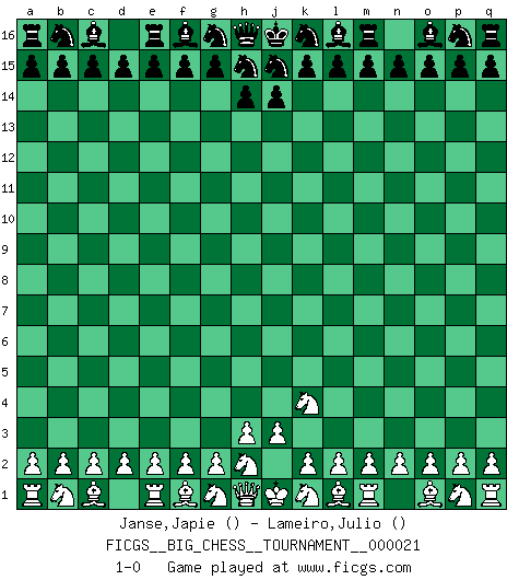 Last move : 1-0 2008 May 27 22:51:13 [Event "FICGS__BIG_CHESS__TOURNAMENT__000021"] [Site "FICGS"] [Date "2008.04.27"] [Round "1"] [White "Janse,Japie"] [Black "Lameiro,Julio"] [Result "1-0"] [WhiteElo ""] [BlackElo ""] 1.j2-k4 1-0 This big chess game has been lost on time (started : 2008.04.27 2:26:22) Follow this game move after move (download)Bobby is the most misunderstood, misquoted celebrity walking the face of this earth. (Yasser Seirawan) Fischer: 'Remis!?' Uhlmann: 'Aber es muss doch dreimal Zugwiederholung sein!' Fischer: 'Sie nehmen das Remis an, wie ich es sage, sonst spiele ich weiter und werde Sie dann schlagen!' (Robert James Fischer) Uno por uno, yo los acribillé, mi superioridad muy pronto se volvio aparente. (Jose Capablanca) Les réformistes prétendent que les progrès de la théorie conduiront à la disparition des échecs, et qu'il faut, pour leur rendre vie, en remanier les règles. En réalité, qu'exprime cette affirmation? Le mépris de l'intuition, de l'imagination et de tous les autres éléments qui font des échecs un art. (Alexander Alekhine) You lose, general Kenobi. (General Grievous in Star Wars ep.3)