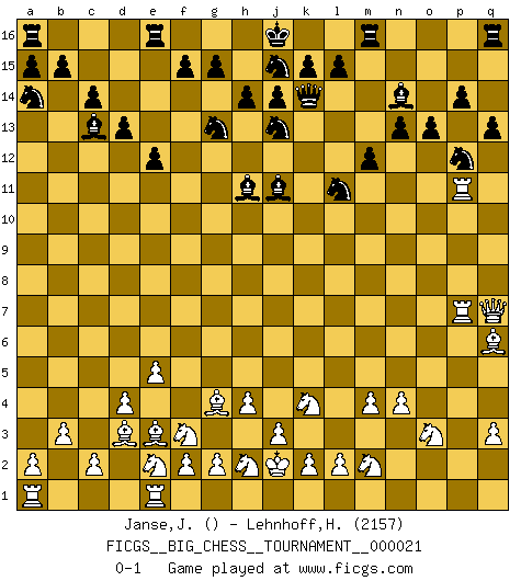Last move : 0-1 2008 August 13 2:10:3 [Event "FICGS__BIG_CHESS__TOURNAMENT__000021"] [Site "FICGS"] [Date "2008.04.27"] [Round "1"] [White "Janse,Japie"] [Black "Lehnhoff,Heinz-Georg"] [Result "0-1"] [WhiteElo ""] [BlackElo "2157"] 1.e2-e4 j15-k13 2.j2-k4 h16-o10 3.h3-h4 o10-o2 4.p1-o3 o2-f10 5.h1-o7 m15-m13 6.g1-f3 e15-e13 7.d2-d4 h15-g13 8.c1-j7 f10-b10 9.b2-b3 p16-o14 10.f1-d3 d15-d13 11.n2-n3 c16-h11 12.j7-g5 b10-a10 13.o1-h7 c15-c14 14.h7-f5 a10-p10 15.f5-h3 p10-p2 16.q2-q3 p2-p9 17.b1-c3 b16-a14 18.e4-e5 k16-h15 19.m2-m3 n15-n13 20.m1-p1 p9-k14 21.n3-n4 l16-n14 22.l1-q6 o14-p12 23.h3-g4 q15-q13 24.o7-q7 o16-b4 25.g5-d2 b4-j11 26.d2-p13 o15-o14 27.p13-e3 f16-c13 28.m3-m4 e13-e12 29.c3-e2 m13-m12 30.k1-m2 k13-l11 31.p1-p11 o14-o13 32.q1-p1 p15-p14 33.p1-p7 g16-j15 34.j1-j2 h15-j13 0-1 Follow this game move after move (download)In Chess, just as in life, today's bliss may be tomorrow's poison. (Assaic) Gewöhnliche Menschen denken nur daran, wie sie ihre Zeit verbringen. Ein intelligenter Mensch versucht, sie auszunutzen. (Arthur Schopenhauer) En el Ajedrez, tal como es jugado por los Maestros, practicamente la suerte es eliminada. (Emanuel Lasker) Celui qui prend des risques peut perdre, celui qui n'en prend pas perd toujours. (Xavier Tartacover) Whenever people agree with me, I always feel I must be wrong. (Oscar Wilde)