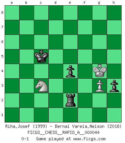 Last move : 0-1 2008 July 4 19:18:10 [Event "FICGS__CHESS__RAPID_A__000044"] [Site "FICGS"] [Date "2008.04.27"] [Round "1"] [White "Riha,Josef"] [Black "Bernal Varela,Nelson"] [Result "0-1"] [WhiteElo "1999"] [BlackElo "2018"] 1.c4 Nf6 2.d4 e6 3.Nf3 b6 4.g3 Bb4+ 5.Bd2 Bxd2+ 6.Qxd2 Ba6 7.b3 c6 8.Bg2 d5 9.O-O O-O 10.Rc1 dxc4 11.bxc4 Nbd7 12.a4 c5 13.Ne5 cxd4 14.Bxa8 Nxe5 15.Bg2 Nxc4 16.Qd3 Ng4 17.Rxc4 Qf6 18.Qf3 Bxc4 19.Qxg4 d3 20.Qxc4 Qxa1 21.Qxd3 Qxa4 22.Be4 h6 23.Nc3 Qa1+ 24.Kg2 a6 25.Qc4 b5 26.Qc5 Qe1 27.Bb7 a5 28.Nxb5 Qxe2 29.Nc3 Qb2 30.Be4 Qb4 31.Qc6 Rb8 32.Kf1 Qb6 33.Qxb6 Rxb6 34.Na4 Rb4 35.Bc2 g5 36.Ke2 g4 37.Kd3 Rb5 38.Bd1 Rd5+ 39.Ke2 Kg7 40.Nc3 Rd8 41.Ke3 f5 42.Bc2 Kf6 43.Na4 e5 44.Nb6 Rd4 45.Na4 h5 46.Nc3 Rd8 47.Bb3 h4 48.Nd5+ Kg5 49.Nc3 e4 50.Bc4 h3 51.Bf1 Kf6 52.Be2 Ke5 53.Nb5 Rd5 54.Na3 a4 55.Nc4+ Ke6 56.Nb6 Rc5 57.Nxa4 Rc1 58.Kf4 Kf6 59.Nb6 Rh1 60.Nd5+ Ke6 61.Nc7+ Kd6 62.Nb5+ Kc5 63.Nc3 Rxh2 64.Kxf5 Rxf2+ 65.Kxg4 Rxe2 0-1 English, 1...Nf6 (Anglo-Indian defense) Kingside Castling by player White (move 9) Kingside Castling by player Black (move 9) 10 pieces endgame at move 64 : White KBNPP , Black KRPPP WHITE : King + 1 Bishop 1 Knight 2 Pawns BLACK : King + 1 Rook 3 Pawns 9 pieces endgame at move 64 : White KBNP , Black KRPPP WHITE : King + 1 Bishop 1 Knight 1 Pawn BLACK : King + 1 Rook 3 Pawns 8 pieces endgame at move 65 : White KBNP , Black KRPP WHITE : King + 1 Bishop 1 Knight 1 Pawn BLACK : King + 1 Rook 2 Pawns 7 pieces endgame at move 65 : White KNP , Black KRPP WHITE : King + 1 Knight 1 Pawn BLACK : King + 1 Rook 2 Pawns Player Black won this chess game. Follow this game move after move (download)Winning isn't everything... but losing is nothing. (Mednis) Besser ein falscher Plan, logisch durchgeführt, als gar kein Plan. (Viktor Kortschnoi) Es muy difícil jugar en contra de la teoría de Einstein. - en su primera derrota en contra de Fischer (Mikhail Tal) Si le désir cupide (et stupide) de gagner est une inépuisable source de souffrance, une combinaison brillante sur l'échiquier est une découverte : le coquelicot qui s'épanouit lorsque apparaît la Voie Lactée. (Arrabal) A specialist learns more and more about less and less until he knows everything about nothing. (Nicholas Murray Butler)