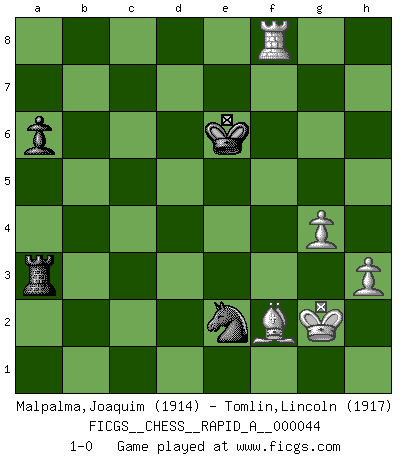 Last move : 1-0 2008 July 9 1:47:49 [Event "FICGS__CHESS__RAPID_A__000044"] [Site "FICGS"] [Date "2008.04.27"] [Round "1"] [White "Malpalma,Joaquim"] [Black "Tomlin,Lincoln"] [Result "1-0"] [WhiteElo "1914"] [BlackElo "1917"] 1.c4 e5 2.Nc3 Nc6 3.Nf3 Nf6 4.g3 d5 5.cxd5 Nxd5 6.Bg2 Nxc3 7.bxc3 e4 8.Ng1 Bf5 9.Qa4 Qf6 10.Bxe4 Be7 11.Rb1 O-O-O 12.Nf3 a6 13.O-O Bxe4 14.Qxe4 Qe6 15.Qxe6+ fxe6 16.d3 Rd5 17.Bd2 Ra5 18.Rb2 b6 19.Rfb1 Kd7 20.Kg2 g5 21.h3 h6 22.Be3 Ba3 23.Rc2 Bd6 24.Nd2 Ne7 25.Ne4 Ra4 26.Nxd6 Kxd6 27.c4 Kd7 28.f3 Rg8 29.Rcb2 e5 30.Bd2 Ke6 31.Kf2 h5 32.Bc3 Nc6 33.Rc1 Ra3 34.Bd2 Rg7 35.g4 h4 36.Bc3 Rd7 37.Ke3 Rf7 38.Kf2 Rd7 39.Bd2 Rg7 40.Rc3 Ra4 41.e3 Kd7 42.a3 Rg6 43.Bc1 Ra5 44.Re2 Rf6 45.f4 exf4 46.exf4 gxf4 47.Re4 Re5 48.Rxf4 R5e6 49.Rxf6 Rxf6+ 50.Kg2 Re6 51.c5 bxc5 52.Bg5 Re2+ 53.Kg1 Kd6 54.Bxh4 Nd4 55.Bg3+ Kd5 56.Bf2 Rd2 57.Kg2 Ke6 58.Rxc5 Rxd3 59.Rc4 c5 60.Rxc5 Ne2 61.Rf5 Rxa3 62.Rf8 1-0 English : Four knights, kingside Fianchetto Queenside Castling by player Black (move 11) Kingside Castling by player White (move 13) 10 pieces endgame at move 60 : White KRBPPP , Black KRNP WHITE : King + 1 Rook 1 Bishop 3 Pawns BLACK : King + 1 Rook 1 Knight 1 Pawn 9 pieces endgame at move 61 : White KRBPP , Black KRNP WHITE : King + 1 Rook 1 Bishop 2 Pawns BLACK : King + 1 Rook 1 Knight 1 Pawn Player White won this chess game. Follow this game move after move (download)I like the moment when I break a man's ego. (Bobby Fischer) Ich habe Putins Aufstieg an die Macht beobachtet und seine Politik, die demokratischen Institutionen meines Landes zu zerstören. (Garry Kasparov) El Ajedrez es un mar en el cual un mosquito puede beber y un elefante puede bañarse. (Refrán Hindú) Le jeu d'échecs fait naître et fortifie en nous plusieurs qualités précieuses dans le cours de l'existence, telles que la prévoyance, la circonspection, la prudence, et la persévérance. (Benjamin Franklin - 1783, la morale des échecs) Excelling at chess has long been considered a symbol of more general intelligence. That is an incorrect assumption in my view, as pleasant as it might be. But for the purposes of argument and investigation, chess is, in Russkin-Gutman's words, 'an unparalleled laboratory, since both the learning process and the degree of ability obtained can be objectified and quantified, providing an excellent comparative framework on which to use rigorous analytical techniques.' (The Chess Master and the Computer, by Garry Kasparov - 2010)