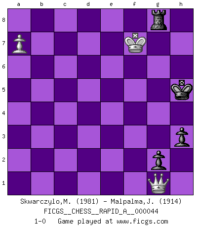 Last move : 1-0 2008 September 10 9:1:17 [Event "FICGS__CHESS__RAPID_A__000044"] [Site "FICGS"] [Date "2008.04.27"] [Round "1"] [White "Skwarczylo,Marek"] [Black "Malpalma,Joaquim"] [Result "1-0"] [WhiteElo "1981"] [BlackElo "1914"] 1.d4 d5 2.Nf3 Nf6 3.c4 c6 4.e3 Bf5 5.cxd5 cxd5 6.Qb3 Qc7 7.Nc3 Nc6 8.Nxd5 Nxd5 9.Qxd5 e6 10.Qb3 Qa5+ 11.Bd2 Bb4 12.a3 Bxd2+ 13.Nxd2 Rb8 14.Bd3 Bxd3 15.Qxd3 Qd5 16.O-O e5 17.Nb3 exd4 18.Rfd1 Rd8 19.Rac1 O-O 20.Nxd4 Nxd4 21.Qxd4 Qxd4 22.Rxd4 Rxd4 23.exd4 Rd8 24.Rc7 Kf8 25.Rxb7 Rxd4 26.Kf1 a5 27.Ke2 Rc4 28.Kd3 Rf4 29.f3 Rf6 30.b3 Rd6+ 31.Kc4 Rd2 32.Kb5 Rxg2 33.Kxa5 Rxh2 34.b4 g5 35.b5 Rf2 36.b6 Rxf3 37.a4 g4 38.Rc7 g3 39.b7 Rb3 40.Ka6 Kg7 41.Rc5 h6 42.a5 f5 43.Rc3 Rxc3 44.b8Q Rc6+ 45.Kb5 Rg6 46.Qb7+ Kh8 47.Qa7 g2 48.Qg1 Kh7 49.a6 h5 50.a7 Rg8 51.Kc4 h4 52.Kd4 h3 53.Ke5 Kg6 54.Kf4 Kh5 55.Kxf5 Rf8+ 56.Ke6 Rg8 57.Kf7 1-0 This chess game has been lost on time (started : 2008.04.27 10:40:52) Queen's pawn game Kingside Castling by player White (move 16) Kingside Castling by player Black (move 19) 10 pieces endgame at move 33 : White KRPPP , Black KRPPP WHITE : King + 1 Rook 3 Pawns BLACK : King + 1 Rook 3 Pawns 9 pieces endgame at move 36 : White KRPP , Black KRPPP WHITE : King + 1 Rook 2 Pawns BLACK : King + 1 Rook 3 Pawns 8 pieces endgame at move 43 : White KPP , Black KRPPP WHITE : King + 2 Pawns BLACK : King + 1 Rook 3 Pawns Promotion Queen by player White (move 44) 7 pieces endgame at move 55 : White KQP , Black KRPP WHITE : King + 1 Queen 1 Pawn BLACK : King + 1 Rook 2 Pawns Player White won this chess game. Follow this game move after move (download)I thought the most common mistake [in chess] was the first one: Learning the game :P (Garvin Gray, FICGS forum) Ein typischer, sehr verbreiteter Gedankenschädling ist der, daß der betreffende Amateur von der Annanhme ausgeht, daß jeder einzelne Zug etwas zu leisten habe. (Aaron Nimzowitsch) Desconfianza es la característica mas necesaria de un jugador de Ajedrez. (Siegbert Tarrasch) L'action d'une oeuvre littéraire se déroule sur un champ de bataille. Les masques et les types du drame moderne correspondent aux pièces du jeu d'échecs. L'intrigue correspond aux coups et aux gambits, c'est à dire aux techniques du jeu telles qu'utilisées et interprétées par les joueurs. Les tactiques et les péripéties [mouvements] correspondent aux coups exécutés par l'adversaire. (Viktor Shklovsky) Macintosh - we might not get everything right, but at least we knew the century was going to end. (Douglas Adams)