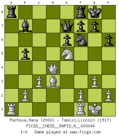 Last move : 1-0 2008 July 20 21:5:24 [Event "FICGS__CHESS__RAPID_A__000044"] [Site "FICGS"] [Date "2008.04.27"] [Round "1"] [White "Pechova,Hana"] [Black "Tomlin,Lincoln"] [Result "1-0"] [WhiteElo "2000"] [BlackElo "1917"] 1.e4 e6 2.d4 d5 3.Nc3 dxe4 4.Nxe4 Nd7 5.Nf3 Ngf6 6.Nxf6+ Nxf6 7.Bg5 h6 8.Bh4 Bd6 9.Bc4 a6 10.Qe2 O-O 11.O-O b5 12.Bd3 Bb7 13.Ne5 Be7 14.c3 Nd5 15.Bxe7 Qxe7 16.g3 c5 17.a4 cxd4 18.axb5 axb5 19.Qe4 Nf6 20.Qxd4 1-0 French : Rubinstein variation Kingside Castling by player Black (move 10) Kingside Castling by player White (move 11) Player White won this chess game. Follow this game move after move (download)Nonsense was the last thing Fischer was interested in, as far as Chess was concerned. (Elie Agur) Du musst nicht gut spielen, es reicht, wenn du besser spielst als dein Gegner. (Anonymous) Un buen jugador siempre tiene buena suerte. (José Raúl Capablanca) RxDa4 pat (...) He is a liar. I just don't know what the lie is yet. (Horatio Caine, C.S.I. Miami)