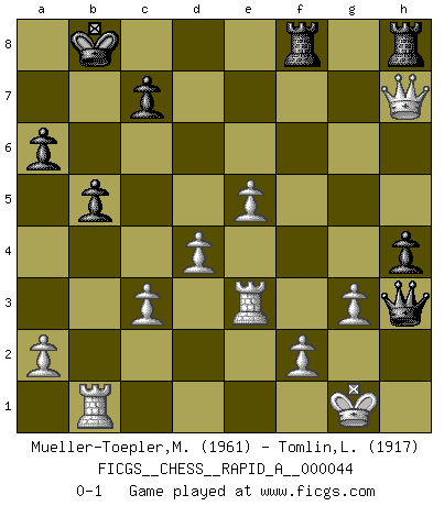 Last move : 0-1 2008 June 3 11:12:3 [Event "FICGS__CHESS__RAPID_A__000044"] [Site "FICGS"] [Date "2008.04.27"] [Round "1"] [White "Mueller-Toepler,Michael"] [Black "Tomlin,Lincoln"] [Result "0-1"] [WhiteElo "1961"] [BlackElo "1917"] 1.c4 e5 2.Nc3 Nc6 3.Nf3 Nf6 4.g3 d5 5.cxd5 Nxd5 6.Bg2 Nxc3 7.bxc3 e4 8.Ng1 Bf5 9.Qa4 Qd7 10.Bxe4 Bxe4 11.Qxe4+ Be7 12.d4 O-O-O 13.Nf3 h5 14.h4 a6 15.O-O Rhe8 16.Qd3 Qh3 17.Re1 f6 18.Bf4 g5 19.hxg5 fxg5 20.Nxg5 Bxg5 21.Bxg5 Ne5 22.Qe4 Nf7 23.Qf4 Nxg5 24.Qxg5 Rg8 25.Qe5 h4 26.e4 Kb8 27.Qf5 Rg4 28.Qh7 Rf8 29.Rab1 R4g8 30.e5 b5 31.Re3 Rh8 0-1 English : Four knights, kingside Fianchetto Queenside Castling by player Black (move 12) Kingside Castling by player White (move 15) Player Black won this chess game. Follow this game move after move (download)You must take your opponent into a deep dark forest where 2+2=5, and the path leading out is only wide enough for one. (Mikhail Tal) Später, ... hatte ich zunehmend Erfolg in entscheidenden Partien. Vielleicht weil ich eine einfache Wahrheit erkannte: nicht nur ich hatte Angst, auch mein Gegner. (Mikhail Nekhemyevich Tal) El jugador táctico sabe que hacer cuando hay algo que hacer; mientras que el estratega sabe que hacer cuando no hay nada que hacer. (Gerald Abrahams) Les réformistes prétendent que les progrès de la théorie conduiront à la disparition des échecs, et qu'il faut, pour leur rendre vie, en remanier les règles. En réalité, qu'exprime cette affirmation? Le mépris de l'intuition, de l'imagination et de tous les autres éléments qui font des échecs un art. (Alexander Alekhine) Real knowledge is to know the extent of one's ignorance. (Confucius)