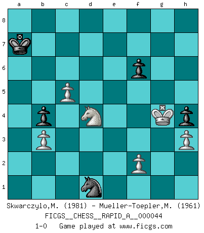 Last move : 1-0 2008 June 21 9:45:16 [Event "FICGS__CHESS__RAPID_A__000044"] [Site "FICGS"] [Date "2008.04.27"] [Round "1"] [White "Skwarczylo,Marek"] [Black "Mueller-Toepler,Michael"] [Result "1-0"] [WhiteElo "1981"] [BlackElo "1961"] 1.d4 d5 2.Nf3 e6 3.c4 c6 4.e3 Nf6 5.Nc3 Nbd7 6.Bd3 dxc4 7.Bxc4 b5 8.Bd3 a6 9.O-O c5 10.a4 b4 11.Ne4 Bb7 12.Ned2 Be7 13.a5 O-O 14.Nc4 Qc7 15.Qe2 cxd4 16.exd4 Ng4 17.Ncd2 Rad8 18.h3 Ngf6 19.Bxa6 Bxa6 20.Qxa6 Ra8 21.Qc4 Qb7 22.Qd3 Rfc8 23.Nb3 Qe4 24.Qxe4 Nxe4 25.Re1 Ndf6 26.Ne5 h6 27.Nd3 Nd6 28.Bd2 Nc4 29.Rec1 Nd5 30.Rc2 Rc7 31.Rac1 Nxd2 32.Rxc7 Nxc7 33.Nxd2 Nd5 34.Nb3 Kf8 35.Kf1 Bd6 36.g3 Ke7 37.Ke2 g5 38.Ndc5 h5 39.Ne4 h4 40.Nxd6 Kxd6 41.gxh4 gxh4 42.Kf3 Ne7 43.Rc5 Nc6 44.Ke3 f6 45.Nd2 Kc7 46.Nc4 Rd8 47.b3 Rd5 48.a6 Rxc5 49.dxc5 Kb8 50.Nd6 Ka7 51.Nb5+ Kxa6 52.Nc7+ Ka7 53.Nxe6 Ne7 54.Nd4 Nd5+ 55.Ke4 Nc3+ 56.Kf5 Nd1 57.Kg4 1-0 Queen's pawn game Kingside Castling by player White (move 9) Kingside Castling by player Black (move 13) Player White won this chess game. Follow this game move after move (download)Chess is a sea in which a gnat may drink and an elephant may bathe. (Hindu proverb) Ich glaube nicht an Psychologie, ich glaube an gute Züge. (Robert James Fischer) A través de las casillas del tablero, los Indios explican el movimiento del tiempo y la edad, las influencias mas altas que controlan el mundo y los lazos que vinculan al Ajedrez con el alma humana. (Al-Masudi) L'ordinateur a tué l'originalité. Il n'y a plus guère d'aventures sur l'échiquier. (Jacob Murray) Either move or be moved. (Ezra Pound)