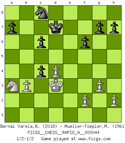 Last move : 1/2-1/2 2008 July 14 16:46:37 [Event "FICGS__CHESS__RAPID_A__000044"] [Site "FICGS"] [Date "2008.04.27"] [Round "1"] [White "Bernal Varela,Nelson"] [Black "Mueller-Toepler,Michael"] [Result "1/2-1/2"] [WhiteElo "2018"] [BlackElo "1961"] 1.e4 e5 2.Nf3 Nf6 3.Nxe5 d6 4.Nf3 Nxe4 5.d4 d5 6.Bd3 Bd6 7.O-O O-O 8.c4 c6 9.Re1 Bf5 10.Nc3 Nxc3 11.bxc3 Bxd3 12.Qxd3 dxc4 13.Qxc4 Nd7 14.Bg5 Qc7 15.Be7 Nb6 16.Bxd6 Qxd6 17.Qb3 Rae8 18.Rad1 Qd5 19.Rb1 Qxb3 20.axb3 f6 21.c4 Rxe1+ 22.Rxe1 Kf7 23.Kf1 Nc8 24.Ke2 Re8+ 25.Kd3 Rxe1 26.Nxe1 Ke6 27.g3 b5 28.Nc2 Kd7 29.Na3 bxc4+ 1/2-1/2 Petrov : Classical attack, Marshall variation Kingside Castling by player White (move 7) Kingside Castling by player Black (move 7) This chess game ended in a draw. Follow this game move after move (download)Place the contents of the Chess box in a hat, shake them up vigorously, pour them on the board from a height of two feet, and you get the style of Steinitz. (H. E. Bird) Wenn du nicht weißt was du tun sollst, warte bis dein Gegner eine Idee hat. Sie wird sicher schlecht sein. (Siegbert Tarrasch) El Ajedrez tiene tanto misterio como las mujeres. (Purdy) On entre au jeu d'Echecs comme on entre en Religion. Pour le joueur d'Echecs, la partie d'Echecs c'est l'office, la messe, le défilé du 1er Mai, le dépôt de gerbe au Monument aux Morts. C'est un drame sacré. (Michel Roos) Work expands to fill the time available. (C. Northcote Parkinson, in Parkinson's Laws)