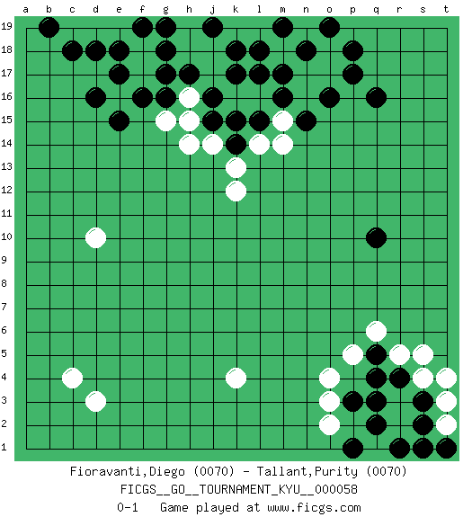 Last move : 0-1 2008 September 10 20:55:10 [Event "FICGS__GO__TOURNAMENT_KYU__000058"] [Site "FICGS"] [Date "2008.04.29"] [Round "1"] [Black "Fioravanti,Diego"] [White "Tallant,Purity"] [Result "0-1"] [Rating 1 "0070"] [Rating 2 "0070"] 1.q16 c4 2.q4 o3 3.d16 d10 4.q10 k16 5.g17 d3 6.k17 l16 7.l17 j17 8.m17 n17 9.n18 n16 10.j16 h16 11.j15 j14 12.h17 j18 13.m16 m15 14.l15 m18 15.m19 k15 16.k14 h15 17.l18 f17 18.g16 h14 19.n15 m14 20.o16 o17 21.p17 o18 22.p18 l14 23.o19 k13 24.k15 h18 25.g18 g19 26.f19 h19 27.k18 f18 28.j19 g15 29.f16 e19 30.g19 e16 31.e18 d19 32.d18 c19 33.c18 r3 34.r4 s5 35.e15 k4 36.e17 p5 37.q5 q6 38.p3 o4 39.s2 r2 40.s3 s4 41.r1 q1 42.q2 s1 43.q3 t2 44.r1 t3 45.p1 o2 46.t1 t4 47.s1 r5 48.b19 k12 0-1 Here are the names of the openings (joseki) played in the four corners : Corner q4 : q4 o3 Hoshi (Hwajeom, Seongjeom, Xingwei`) 4-4 Point. The star or hoshi (4-4) point, emphasizing influence at the potential expense of territory. Ikken Kakari (Hankan Keolch'im, Yi Gua`jiao~, 1-Space Low Approach). White 2 is the standard approach move to the 4-4. Corner q16 : q16 l16 Hoshi (Hwajeom, Seongjeom, Xingwei`) 4-4 Point. The star or hoshi (4-4) point, emphasizing influence at the potential expense of territory. Player White won this Go (weiqi, baduk) game. Follow this game move after move (download)Josekis are not fixed, definitive things. They indicate the moments when everything can change. (Pierre Audouard) It's not the will to win, but the will to prepare to win that makes the difference. (Bear Bryant)