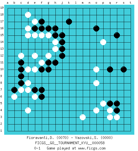 Last move : 0-1 2008 September 11 18:23:51 [Event "FICGS__GO__TOURNAMENT_KYU__000058"] [Site "FICGS"] [Date "2008.04.29"] [Round "1"] [Black "Fioravanti,Diego"] [White "Vazovski,Sergey"] [Result "0-1"] [Rating 1 "0070"] [Rating 2 "0000"] 1.s10 d4 2.r15 d16 3.k17 r3 4.r4 q4 5.r5 q3 6.o16 d10 7.q5 m3 8.e16 e15 9.f16 d15 10.h16 g15 11.g16 f15 12.h15 p5 13.q10 o4 14.h11 h14 15.j15 e17 16.f17 d18 17.j14 h13 18.f10 f11 19.g10 e10 20.g11 e12 21.j13 e6 22.f7 g12 23.f6 o8 24.j12 o10 25.e7 d7 26.c9 d8 27.c10 p14 28.c11 c12 29.c8 c7 30.b7 b6 0-1 Here are the names of the openings (joseki) played in the four corners : Corner q4 : r3 r4 San-San (Sam-Sam, San-San) 3-3 Point. The San-San (3-3) point, emphasizing territory at the expense of influence. This move is not recommended. Black should envisage 4-4, 5-3, 6-4, 5-4 or 6-3 instead. Corner d16 : d16 e16 Hoshi (Hwajeom, Seongjeom, Xingwei`) 4-4 Point. The star or hoshi (4-4) point, emphasizing influence at the potential expense of territory. Player White won this Go (weiqi, baduk) game. Follow this game move after move (download)The simplest move is the best move. (Anonymous) After growing wildly for years, the field of computing appears to be reaching its infancy. (John Pierce)