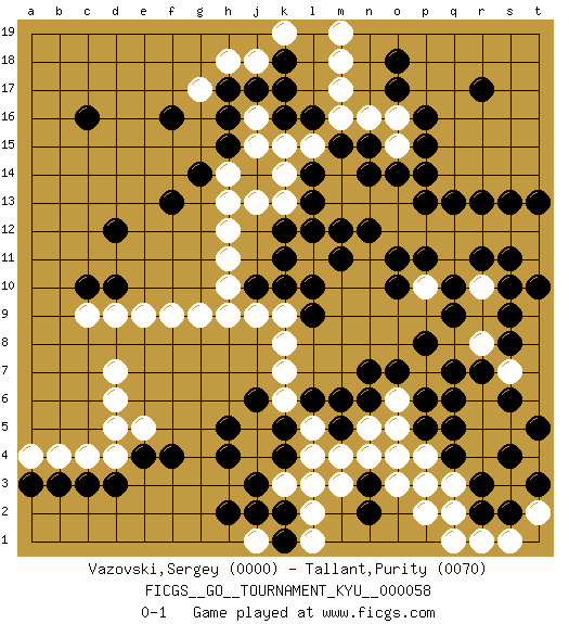 Last move : 0-1 2008 December 10 2:5:12 [Event "FICGS__GO__TOURNAMENT_KYU__000058"] [Site "FICGS"] [Date "2008.04.29"] [Round "1"] [Black "Vazovski,Sergey"] [White "Tallant,Purity"] [Result "0-1"] [Rating 1 "0000"] [Rating 2 "0070"] 1.r17 d4 2.c16 r4 3.q10 e9 4.k16 j9 5.q6 o5 6.p5 q3 7.q4 p4 8.q5 r6 9.q7 q8 10.p8 p10 11.q9 r8 12.r7 s7 13.s8 r9 14.s9 r10 15.r11 s10 16.s11 d6 17.d12 d9 18.k4 p7 19.o7 o6 20.p6 q11 21.t10 r5 22.s6 r8 23.p3 o4 24.r3 r10 25.s4 q2 26.r2 p2 27.k10 k9 28.l9 o3 29.l10 s5 30.t5 p3 31.l6 q1 32.n6 n5 33.m5 l5 34.k5 l4 35.l3 m4 36.m6 m3 37.p11 q12 38.o10 p12 39.o11 k3 40.j3 l2 41.h4 k6 42.j6 k7 43.n7 k8 44.h5 h9 45.k2 l3 46.h2 l1 47.k1 r1 48.e4 d5 49.d3 e5 50.c3 g9 51.f4 f9 52.n3 n4 53.n2 s1 54.s2 t2 55.t3 j1 56.j2 c4 57.b3 b4 58.a3 a4 59.f16 d7 60.p16 h13 61.j10 h10 62.p13 o12 63.n12 o13 64.p14 n13 65.m12 m13 66.l13 l12 67.k12 l11 68.m11 k13 69.l14 l15 70.m15 m14 71.k11 k14 72.l12 m16 73.n15 k15 74.q13 r12 75.r13 s12 76.s13 t12 77.t13 t11 78.s10 o15 79.o14 n16 80.n14 o16 81.h16 m17 82.l16 j16 83.j17 j15 84.k17 j13 85.h15 h11 86.f13 h12 87.o17 m18 88.o18 m19 89.p15 h18 90.h17 j18 91.k18 k19 92.c10 c9 93.d10 h14 94.g14 g17 0-1 Here are the names of the openings (joseki) played in the four corners : Corner q4 : r4 q6 Komoku (Somok, Xiao~mu`) 3-4 Point. The komoku (3-4) point is the traditional corner enclosure move.. Player White won this Go (weiqi, baduk) game. Follow this game move after move (download)When you study joseki, you lose two stones in strength. (Anonymous) Lamb in skin of tiger, still fears the wolf. (Chinese proverb)