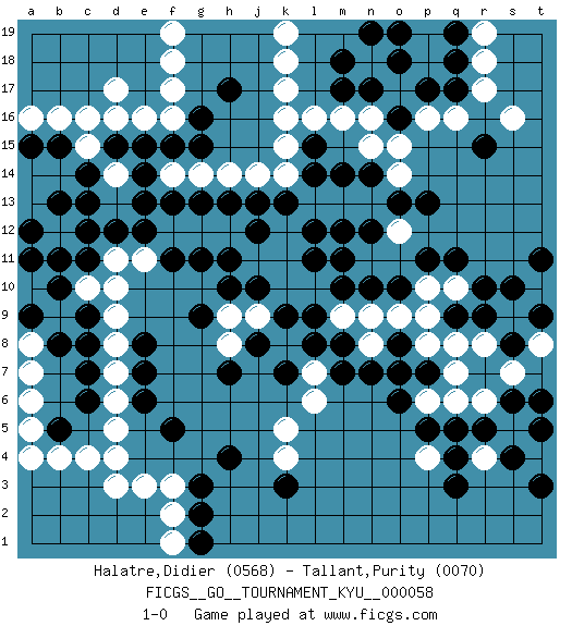 Last move : 1-0 2008 October 22 15:38:48 [Event "FICGS__GO__TOURNAMENT_KYU__000058"] [Site "FICGS"] [Date "2008.04.29"] [Round "1"] [Black "Halatre,Didier"] [White "Tallant,Purity"] [Result "1-0"] [Rating 1 "0568"] [Rating 2 "0070"] 1.r15 d4 2.q17 c15 3.r5 f3 4.k3 k17 5.m17 d17 6.c11 f17 7.g16 f18 8.r10 d5 9.c9 k16 10.c7 b4 11.e7 c4 12.h4 e3 13.f5 c16 14.q3 d10 15.c13 d16 16.c14 d3 17.g2 f16 18.g15 e16 19.f15 c10 20.b10 d9 21.c8 d7 22.e6 d6 23.c6 a4 24.l15 d8 25.e8 c12 26.d12 b12 27.b11 d11 28.b13 a10 29.a12 b9 30.b8 a8 31.a9 f2 32.g3 b9 33.a11 a6 34.a9 a7 35.b15 b16 36.a15 a16 37.b5 a5 38.c12 f1 39.g1 f19 40.h17 e11 41.e12 f12 42.f13 f14 43.e14 g14 44.g13 h14 45.h13 k14 46.l14 j14 47.f11 g12 48.g11 h12 49.j13 k12 50.k13 l13 51.l12 m13 52.j12 j11 53.h11 k11 54.l11 k10 55.j10 j9 56.h10 h9 57.g9 l10 58.m11 k15 59.k9 k8 60.l9 m9 61.l8 l7 62.m8 n8 63.m7 k4 64.m10 n9 65.j8 h8 66.k7 l6 67.h7 k18 68.e15 d14 69.d15 k19 70.e13 m16 71.m14 n13 72.n14 o14 73.o13 o15 74.o10 o9 75.n7 o7 76.n10 p10 77.q9 p9 78.p11 p8 79.p7 q8 80.o6 p6 81.o8 q7 82.o7 q6 83.p5 r6 84.s8 l16 85.n12 o12 86.p13 n15 87.m12 n16 88.n17 o17 89.o18 n18 90.m18 p18 91.n19 p19 92.p17 p16 93.q18 q16 94.o16 q10 95.r9 r8 96.q11 s7 97.s6 s9 98.s10 t8 99.t6 s5 100.s4 r4 101.q5 t4 102.t5 p4 103.q4 r17 104.q19 r18 105.o19 t10 106.t11 s16 107.t3 r19 108.t9 k5 109.s8 1-0 Here are the names of the openings (joseki) played in the four corners : Player Black won this Go (weiqi, baduk) game. Follow this game move after move (download)Go is essentially a form of harmony. Go in the 21st century will have to be go of the 'harmony of the six points - the four quarters, the above and the below.' As in life we will need to view the whole rather than the part. Japanese go has focused too heavily on the local (joseki) rather than the whole for 300 years. The reason the Chinese and Koreans are overtaking the Japanese is that they are closer to achieve this whole-board view. (Go Seigen, 9p, 1994) I'll be back. (Arnold Schwarzenegger)