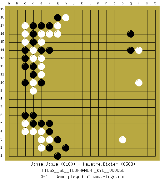 Last move : 0-1 2008 July 27 16:31:50 [Event "FICGS__GO__TOURNAMENT_KYU__000058"] [Site "FICGS"] [Date "2008.04.29"] [Round "1"] [Black "Janse,Japie"] [White "Halatre,Didier"] [Result "0-1"] [Rating 1 "0100"] [Rating 2 "0568"] 1.q16 c5 2.d5 d4 3.e5 e4 4.f4 f3 5.f5 p3 6.g3 g2 7.f2 e3 8.h2 e2 9.g1 c15 10.c6 c4 11.d6 d10 12.c14 d14 13.c13 d13 14.d12 e12 15.d11 e11 16.c12 g16 17.c10 r14 18.q14 r10 19.e10 d9 20.d15 e15 21.d16 c16 22.e14 e13 23.f14 e16 24.d17 c17 25.e17 f16 26.f17 g17 27.g18 h18 0-1 This go game has been lost on time (started : 2008.04.29 17:3:12) Here are the names of the openings (joseki) played in the four corners : Corner d4 : c5 d5 Mokuhazushi (Waemok, Wai`mu`) 5-3 Point. The mokuhazushi (5-3) point was popular in the Edo period in Japan (1600 - 1867). It emphasizes influence; territorially, it is inferior to the 3-4 point. Corner d16 : c15 c14 Mokuhazushi (Waemok, Wai`mu`) 5-3 Point. The mokuhazushi (5-3) point was popular in the Edo period in Japan (1600 - 1867). It emphasizes influence; territorially, it is inferior to the 3-4 point. Corner q16 : q16 r14 Hoshi (Hwajeom, Seongjeom, Xingwei`) 4-4 Point. The star or hoshi (4-4) point, emphasizing influence at the potential expense of territory. Ikken Kakari (Hankan Keolch'im, Yi Gua`jiao~, 1-Space Low Approach). White 2 is the standard approach move to the 4-4. Player White won this Go (weiqi, baduk) game. Follow this game move after move (download)Pon-nuki is worth thirty points. (Anonymous) There are 10 types of people in this world: those who understand binary and those who don't. (Anonymous)