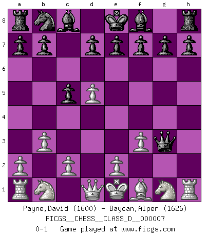 Last move : 0-1 2006 August 25 18:41:5 [Event "FICGS__CHESS__CLASS_D__000007"] [Site "FICGS"] [Date "2006.07.14"] [Round "1"] [White "Payne,David"] [Black "Baycan,Alper"] [Result "0-1"] [WhiteElo "1600"] [BlackElo "1626"] 1.d4 Nf6 2.Bg5 c5 3.d5 Qb6 4.b3 Ne4 5.Bd2 Qf6 6.f3 Qh4+ 7.g3 Nxg3 8.Bg5 Qxg5 9.hxg3 Qxg3+ 0-1 This chess game has been lost on time (started : 2006.07.14 18:32:41) Trompowsky attack (Ruth, Opovcensky Opening) Player Black won this chess game. Follow this game move after move (download)Let the perfectionist play postal. (Yasser Seirawan) Es gibt zwei Arten von Opfern: Korrekte und meine. (Mikhail Nekhemyevich Tal) Cuando estes solo, cuando te sientas un extraño en el mundo, juega al Ajedrez. Esto levantará tu espiritu y será tu consejero de guerra. (Aristóteles) Avant la finale, les dieux ont créé le milieu de partie. (Tarrasch) The only thing that overcomes hard luck is hard work. (Harry Golden)