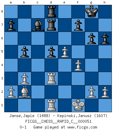 Last move : 0-1 2008 August 4 4:59:35 [Event "FICGS__CHESS__RAPID_C__000051"] [Site "FICGS"] [Date "2008.05.01"] [Round "1"] [White "Janse,Japie"] [Black "Kepinski,Janusz"] [Result "0-1"] [WhiteElo "1488"] [BlackElo "1607"] 1.e4 e6 2.d4 d5 3.exd5 exd5 4.Nf3 Nf6 5.Be2 Bd6 6.O-O h6 7.Bb5+ c6 8.Re1+ Be6 9.Bd3 O-O 10.b3 Re8 11.Nbd2 Nh5 12.Bb2 Nf4 13.Ne5 Nxd3 14.Nxd3 Nd7 15.c4 b6 16.Rc1 Qg5 17.Nf3 Qh5 18.Nfe5 Qxd1 19.Rcxd1 Nxe5 20.dxe5 Bc7 21.cxd5 Bxd5 22.Nb4 Rad8 23.Nxd5 cxd5 24.Rd3 Rd7 25.Kf1 Kf8 26.Ba3+ Kg8 27.f4 g6 28.Red1 Red8 29.Bb2 b5 0-1 This chess game has been lost on time (started : 2008.05.01 19:42:24) French : Exchange variation Kingside Castling by player White (move 6) Kingside Castling by player Black (move 9) Player Black won this chess game. Follow this game move after move (download)You are for me the Queen on d8 and I am the Pawn on d7 !! (Eduard Gufeld) Der Knackpunkt bei der Konzentration ist, daß wir nur durch sie etwas Neues und Ungewöhnliches am Schachbrett finden können. Sie ist der einzige Weg durch neue neue Ideen eine Überraschung zu bereiten. (Garry Kasparov) Dejen al perfeccionista jugar por correo. (Yasser Seirawan) La victoire dans une partie d'Echecs appartient la plupart du temps à celui qui voit un peu plus loin que l'adversaire. (Lasker) The only thing that overcomes hard luck is hard work. (Harry Golden)