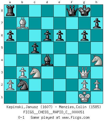 Last move : 0-1 2008 July 4 20:51:35 [Event "FICGS__CHESS__RAPID_C__000051"] [Site "FICGS"] [Date "2008.05.01"] [Round "1"] [White "Kepinski,Janusz"] [Black "Menzies,Colin"] [Result "0-1"] [WhiteElo "1607"] [BlackElo "1585"] 1.d4 Nf6 2.c4 g6 3.Nf3 Bg7 4.Nc3 O-O 5.e4 d6 6.Be2 c5 7.O-O Nbd7 8.d5 Qc7 9.b3 Nxe4 10.Nb5 Qd8 11.Rb1 a6 12.Qd3 Ndf6 13.Na3 Bf5 14.Nh4 Nxf2 15.Qf3 Bxb1 16.Nxb1 N2g4 17.Qg3 Ne5 18.Bb2 e6 19.dxe6 fxe6 20.Nc3 Nh5 21.Bxh5 Nxc4 22.Rxf8+ Qxf8 23.Bf3 Nxb2 24.Bxb7 Bd4+ 0-1 King's Indian, 3.Nf3 Kingside Castling by player Black (move 4) Kingside Castling by player White (move 7) Player Black won this chess game. Follow this game move after move (download)In complicated positions, Bobby Fischer hardly had to be afraid of anybody. (Paul Keres) Kritik überlasse ich den Spießern. Ich zeige nichts, wofür ich mich schämen muss. (Alexandra Kosteniuk) De eso se trata el Ajedrez. Un día le das una lección a tu oponente y al día siguiente el te da una a tí. (Bobby Fischer) Aux échecs, les retours au sommet sont rares : les dommages psychologiques consécutifs à une défaite sont trop sévères. (Daily Telegraph) Winning isn't everything... but losing is nothing. (Mednis)