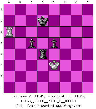 Last move : 0-1 2008 July 20 10:48:22 [Event "FICGS__CHESS__RAPID_C__000051"] [Site "FICGS"] [Date "2008.05.01"] [Round "1"] [White "Sakharov,Vitalij"] [Black "Kepinski,Janusz"] [Result "0-1"] [WhiteElo "1545"] [BlackElo "1607"] 1.f4 b5 2.Nf3 Bb7 3.e3 a6 4.Be2 c5 5.O-O Nc6 6.c3 g6 7.d4 e6 8.Ne5 cxd4 9.exd4 d6 10.Nxc6 Bxc6 11.Nd2 Bg7 12.Bf3 Ne7 13.Bxc6+ Nxc6 14.f5 gxf5 15.d5 Ne5 16.dxe6 fxe6 17.Qh5+ Ng6 18.Nf3 Qd7 19.Bh6 O-O 20.Rad1 Bxh6 21.Qxh6 Rfe8 22.Ng5 Rad8 23.Kh1 Qg7 24.Qh5 Re7 25.Rf3 Ne5 26.Rg3 Ng4 27.Rf1 Rf8 28.h3 Rf6 29.Qxh7+ Qxh7 30.Nxh7 Rxh7 31.Rxg4+ Kf7 32.Rd4 e5 33.Rd5 f4 34.a4 bxa4 35.Ra1 f3 36.gxf3 Rxh3+ 37.Kg2 R6xf3 38.Rxa4 Rhg3+ 39.Kh2 Rh3+ 40.Kg2 Ke6 41.Rd2 Rd3 42.Rxd3 Rxd3 43.Rxa6 Rd2+ 44.Kf3 Rxb2 45.Ke3 Rh2 46.c4 Kd7 47.Ke4 Rd2 48.c5 Rd4+ 49.Ke3 dxc5 0-1 Bird's Opening Kingside Castling by player White (move 5) Kingside Castling by player Black (move 19) 10 pieces endgame at move 42 : White KRRPP , Black KRPPP WHITE : King + 2 Rooks 2 Pawns BLACK : King + 1 Rook 3 Pawns 9 pieces endgame at move 42 : White KRPP , Black KRPPP WHITE : King + 1 Rook 2 Pawns BLACK : King + 1 Rook 3 Pawns 8 pieces endgame at move 43 : White KRPP , Black KRPP WHITE : King + 1 Rook 2 Pawns BLACK : King + 1 Rook 2 Pawns 7 pieces endgame at move 44 : White KRP , Black KRPP WHITE : King + 1 Rook 1 Pawn BLACK : King + 1 Rook 2 Pawns 6 pieces endgame at move 49 : White KR , Black KRPP WHITE : King + 1 Rook BLACK : King + 1 Rook 2 Pawns Player Black won this chess game. Follow this game move after move (download)Capture of the adverse King is the ultimate but not the first object of the game. (William Steinitz) Schach ist ein schwarz-weisser Dschungel. (Garry Kasparov) Del Ajedrez se ha dicho que la vida no es lo suficientemente larga para él, pero eso es culpa de la vida, no del Ajedrez. (William Ewart Napier) RxDa4 pat (...) Wikichess, chess moves explained by 'experimented' players. (Thibault de Vassal)