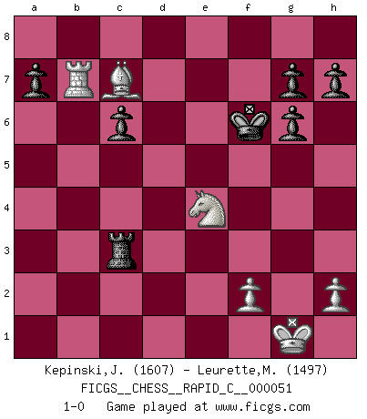 Last move : 1-0 2008 May 15 16:57:5 [Event "FICGS__CHESS__RAPID_C__000051"] [Site "FICGS"] [Date "2008.05.01"] [Round "1"] [White "Kepinski,Janusz"] [Black "Leurette,Marc-Antoine"] [Result "1-0"] [WhiteElo "1607"] [BlackElo "1497"] 1.e4 e5 2.Bc4 Nf6 3.d4 exd4 4.Nf3 Nc6 5.e5 d5 6.Bb5 Bb4+ 7.c3 dxc3 8.bxc3 Ba5 9.exf6 Qxf6 10.O-O O-O 11.Qxd5 Bg4 12.Bxc6 bxc6 13.Qxa5 Bxf3 14.gxf3 Qd6 15.Qg5 Rae8 16.Bf4 Qg6 17.Qxg6 fxg6 18.Bxc7 Rxf3 19.Nd2 Rxc3 20.Rac1 Rd3 21.Nb3 Re2 22.Rfe1 Rxa2 23.Re8+ Kf7 24.Rb8 Ra3 25.Nc5 Rdc3 26.Rxc3 Rxc3 27.Rb7 Kf6 28.Ne4+ 1-0 Bishop's Opening : Urusov gambit Kingside Castling by player White (move 10) Kingside Castling by player Black (move 10) Player White won this chess game. Follow this game move after move (download)If your opponent cannot do anything active, then don't rush the position; instead you should let him sit there, suffer, and beg you for a draw. (Jeremy Silman) Ich war zu klein für die Schach-Schülermannschaft! (Woody Allen) No hay un Gran Maestro de Ajedrez que sea normal; solo se diferencían ellos por la magnitud de su locura. (Viktor Korchnoi) Pour se monter efficace, un Cavalier a besoin d'avant-postes ! Les Cavaliers font les meilleurs bloqueurs de pions passés. War is the child of passion, passion is the child of narcissism and narcissism is the child. (...) Another game ? (Thibault de Vassal)