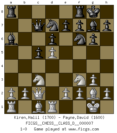 Last move : 1-0 2006 November 5 21:20:1 [Event "FICGS__CHESS__CLASS_D__000007"] [Site "FICGS"] [Date "2006.07.14"] [Round "1"] [White "Kiren,Halil"] [Black "Payne,David"] [Result "1-0"] [WhiteElo "1700"] [BlackElo "1600"] 1.d4 Nf6 2.c4 c5 3.d5 b5 4.cxb5 a6 5.bxa6 d6 6.Nc3 Bxa6 7.g3 g6 8.Bg2 Bg7 9.Nf3 O-O 10.O-O Qc7 11.Qc2 Nbd7 12.Rd1 1-0 This chess game has been lost on time (started : 2006.07.14 18:32:41) Benko gambit accepted Kingside Castling by player Black (move 9) Kingside Castling by player White (move 10) Player White won this chess game. Follow this game move after move (download)The blunders are all there on the board, waiting to be made. (Savielly Tartakover) Kombinieren und Schwarzhandel gehören verboten. (Savielly Grigorievitsch Tartakower) El tablero es el mundo, las piezas es el fenomeno del universo, las reglas del juego son lo que llamamos leyes de la naturaleza y el jugador del lado opuesto, se encuentra oculto a nuestra vista. (Thomas Huxley) Dieu déplace le joueur, et celui-ci la pièce. Quel Dieu derrière Dieu commence donc la trame ? Arturo Perez-Reverte (prix de littérature policière 1993). The best weapon against an enemy is another enemy. (Friedrich Nietzsche)