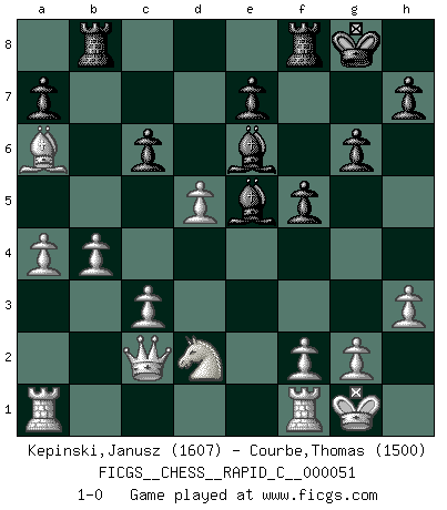 Last move : 1-0 2008 May 12 20:48:52 [Event "FICGS__CHESS__RAPID_C__000051"] [Site "FICGS"] [Date "2008.05.01"] [Round "1"] [White "Kepinski,Janusz"] [Black "Courbe,Thomas"] [Result "1-0"] [WhiteElo "1607"] [BlackElo "1500"] 1.d4 g6 2.e4 Bg7 3.Nf3 c5 4.dxc5 Qa5+ 5.c3 Qxc5 6.Be2 d6 7.O-O Nf6 8.Qc2 O-O 9.Be3 Qc6 10.Nbd2 Be6 11.Nd4 Na6 12.Nxc6 bxc6 13.Bxa6 Rab8 14.b4 Ng4 15.a4 f5 16.h3 Ne5 17.Bd4 d5 18.Bxe5 Bxe5 19.exd5 1-0 Modern defense Kingside Castling by player White (move 7) Kingside Castling by player Black (move 8) Player White won this chess game. Follow this game move after move (download)Don't even mention losing to me. I can't stand to think of it. (Bobby Fischer) Wenn ich mich einlogge, glauben die Leute gewöhnlich nicht, dass ich es selbst bin und sie fangen an, mir dumme Fragen zu stellen. Und wenn sie es glauben, stellen sie wieder andere dumme Fragen. (Judith Polgar) El Ajedrez es de 30 a 40 por ciento psicología. Uno no cuenta con esto cuando se juega contra una computadora. No lo puedo confundir. (Judith Polgar) Les Echecs représentent une sphère d'idées créatrices basée sur la volonté des deux protagonistes. (Smyslov) It is not titles that honor men, but men that honor titles. (Niccolo Machiavelli)
