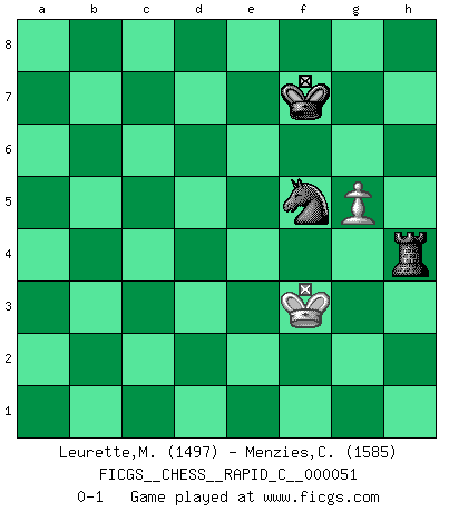 Last move : 0-1 2008 June 6 9:59:12 [Event "FICGS__CHESS__RAPID_C__000051"] [Site "FICGS"] [Date "2008.05.01"] [Round "1"] [White "Leurette,Marc-Antoine"] [Black "Menzies,Colin"] [Result "0-1"] [WhiteElo "1497"] [BlackElo "1585"] 1.e4 c5 2.Nf3 d6 3.d4 cxd4 4.Nxd4 Nf6 5.Nc3 a6 6.Bc4 e6 7.O-O Be7 8.Be3 b5 9.Bb3 Bb7 10.Qd3 b4 11.Nce2 Bxe4 12.Qd2 d5 13.Ba4+ Kf8 14.f3 Bg6 15.a3 e5 16.Nc6 Nxc6 17.Bxc6 Rc8 18.Bb7 Rxc2 19.Qd1 d4 20.Nxd4 exd4 21.Bxd4 bxa3 22.bxa3 a5 23.Rf2 Rxf2 24.Bxf2 Qxd1+ 25.Rxd1 Bxa3 26.Rd8+ Ne8 27.Bc6 Ke7 28.Ra8 Bb4 29.Bb6 Rf8 30.Bxa5 Bxa5 31.Rxa5 Nd6 32.Ra7+ Kf6 33.Rd7 Ke6 34.g4 Rc8 35.Ba4 Bc2 36.Bxc2 Kxd7 37.Bxh7 g6 38.Kg2 Rh8 39.Bxg6 fxg6 40.h3 Ke6 41.Kg3 g5 42.f4 gxf4+ 43.Kxf4 Rxh3 44.g5 Rh4+ 45.Kg3 Nf5+ 46.Kf3 Kf7 0-1 Sicilian : Najdorf, Lipnitzky attack Kingside Castling by player White (move 7) 10 pieces endgame at move 37 : White KBPPP , Black KRNPP WHITE : King + 1 Bishop 3 Pawns BLACK : King + 1 Rook 1 Knight 2 Pawns 9 pieces endgame at move 39 : White KBPPP , Black KRNP WHITE : King + 1 Bishop 3 Pawns BLACK : King + 1 Rook 1 Knight 1 Pawn 8 pieces endgame at move 39 : White KPPP , Black KRNP WHITE : King + 3 Pawns BLACK : King + 1 Rook 1 Knight 1 Pawn 7 pieces endgame at move 42 : White KPP , Black KRNP WHITE : King + 2 Pawns BLACK : King + 1 Rook 1 Knight 1 Pawn 6 pieces endgame at move 43 : White KPP , Black KRN WHITE : King + 2 Pawns BLACK : King + 1 Rook 1 Knight 5 pieces endgame at move 43 : White KP , Black KRN WHITE : King + 1 Pawn BLACK : King + 1 Rook 1 Knight Player Black won this chess game. Follow this game move after move (download)I have always a slight feeling of pity for the man who has no knowledge of Chess. (Siegbert Tarrasch) Dass jemand wie Surab Asmaiparaschwili, der selbst Elopunkte gekauft hat , Vize-Präsident der Fide werden konnte, sagt schon einges über den Zustand dieser Organisation aus. (Joel Lautier) Todos los Maestros de Ajedrez fueron un día unos principiantes. (Chernev) Psychologiquement, tu dois avoir confiance en toi même, mais cette confiance doit être basée sur des faits. (Robert Fischer) Perhaps chess is the wrong game for the times (The Chess Master and the Computer, by Garry Kasparov - 2010)