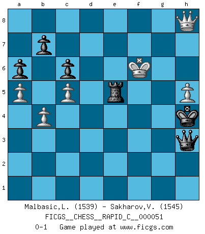 Last move : 0-1 2008 August 7 23:7:38 [Event "FICGS__CHESS__RAPID_C__000051"] [Site "FICGS"] [Date "2008.05.01"] [Round "1"] [White "Malbasic,Ljubisa"] [Black "Sakharov,Vitalij"] [Result "0-1"] [WhiteElo "1539"] [BlackElo "1545"] 1.d4 e6 2.Nf3 f5 3.e3 Nf6 4.Nbd2 d5 5.c4 c6 6.b3 Be7 7.Bb2 O-O 8.Be2 Ne4 9.O-O Nd7 10.Nxe4 fxe4 11.Nd2 Nf6 12.Rc1 a6 13.h3 Bd7 14.c5 Kh8 15.a4 Be8 16.b4 Bg6 17.a5 Qe8 18.f4 Bh5 19.Bxh5 Nxh5 20.Kh2 g5 21.g4 Nxf4 22.exf4 gxf4 23.Rc3 f3 24.Bc1 Qf7 25.Nxf3 exf3 26.Rcxf3 Qg7 27.Bf4 Bf6 28.Be5 Bxe5+ 29.dxe5 Qxe5+ 30.Kg1 Rxf3 31.Qxf3 Rg8 32.Qf6+ Qxf6 33.Rxf6 e5 34.Rf7 Rb8 35.Kf2 Kg8 36.Re7 Rf8+ 37.Ke3 Rf7 38.Rxe5 Kg7 39.h4 Kf6 40.Kd4 Rg7 41.g5+ Kg6 42.Re6+ Kh5 43.Rh6+ Kg4 44.Ke5 Rf7 45.Ke6 Rg7 46.Kf6 Rd7 47.h5 d4 48.g6 d3 49.gxh7 d2 50.h8Q d1Q 51.Rg6+ Kh4 52.Rg5 Qf3+ 53.Rf5 Qc3+ 54.Re5 Rd5 55.Ke6 Qh3+ 56.Kf6 Rxe5 0-1 Queen's pawn Kingside Castling by player Black (move 7) Kingside Castling by player White (move 9) Promotion Queen by player White (move 50) Promotion Queen by player Black (move 50) Player Black won this chess game. Follow this game move after move (download)Chess is war over the board. The object is to crush the opponents mind. (Bobby Fischer) Wer mein Gambit spielt, muß bereit sein, alle Brücken hinter sich abzubrechen. Es verändert den ganzen Menschen. Es wirkt wie ein Zauberstab und fördert verkümmerte, gute Charakter- eigenschaften wieder zu Tage. (Emil Joseph Diemer) A la fecha, Fischer esta simplemente un nivel arriba de todos los mejores jugadores de Ajedrez del mundo. (John Jacobs) Je crois qu'il existe des manières très spécifiques de jouer efficacement contre une machine. Evidemment, nous n'avons aucune chance en technique pure, parce que l'ordinateur calcule de manière parfaite. Mais lorsque nous faisons appel à notre cerveau, en utilisant l'intuition et la compréhension, alors nous restons beaucoup plus forts. (Anatoli Karpov) . 'gn is not allowed in chess unless n is an integer between 1 and 8 inclusive, where 1 and 8 are to interpreted as the standard numerals standing for integers in the ordered real-closed field R, with the *canonical* ordering. (As opposed to, say, an integer in the domain Z[2+i*sqrt(5)] or an integer in some exotic Grothendieck topos). (Normajean Yates)
