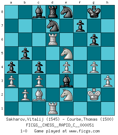 Last move : 1-0 2008 June 7 11:43:14 [Event "FICGS__CHESS__RAPID_C__000051"] [Site "FICGS"] [Date "2008.05.01"] [Round "1"] [White "Sakharov,Vitalij"] [Black "Courbe,Thomas"] [Result "1-0"] [WhiteElo "1545"] [BlackElo "1500"] 1.e4 g6 2.f4 Bg7 3.Nf3 d6 4.Bc4 Nd7 5.d3 Ngf6 6.O-O O-O 7.Nc3 c6 8.Ne2 Ng4 9.h3 Ngf6 10.f5 a5 11.fxg6 hxg6 12.c3 b5 13.Bb3 a4 14.Bc2 e5 15.Be3 c5 16.a3 Rb8 17.d4 c4 18.dxe5 dxe5 19.Qd6 Rb6 20.Bxb6 Nxb6 21.Rad1 Qxd6 22.Rxd6 Nbd7 23.Rfd1 Rd8 24.g4 Bf8 25.R6d2 Bc5+ 26.Kg2 Be3 27.Rd6 Ne8 28.Nxe5 1-0 Robatsch (Modern) defense Kingside Castling by player White (move 6) Kingside Castling by player Black (move 6) Player White won this chess game. Follow this game move after move (download)The only thing Chess players have in common is Chess. (Lodewijk Prins) Es ist nicht das erste mal, dass sich die FIDE dem Arabischen Geld gebeugt hat (über die FIDE WM 2004 in Lybien). (Larry Evans) Te sientas frente a un tablero y repentinamente tu corazón brinca. Tu mano tiembla al tomar una pieza y moverla. Pero lo que el Ajedrez te enseña es que tu debes permanecer ahí con calma y pensar de que si realmente es una buena idea o de que si hay otras ideas mejores. (Stanley Kubrick) Les Echecs ne sont pas pour les âmes timides. Ils requièrent un homme entier, qui ne s'arrête pas aveuglément à ce qui a été déjà établi, mais qui tente individuellement de sonder les profondeurs du jeu. (W. Steinitz) Shallow men believe in luck. Strong men belive in cause and effect. (Ralph Waldo Emerson)