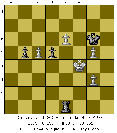 Last move : 0-1 2008 June 7 11:43:28 [Event "FICGS__CHESS__RAPID_C__000051"] [Site "FICGS"] [Date "2008.05.01"] [Round "1"] [White "Courbe,Thomas"] [Black "Leurette,Marc-Antoine"] [Result "0-1"] [WhiteElo "1500"] [BlackElo "1497"] 1.c4 e5 2.Nc3 Nf6 3.g3 Nc6 4.Bg2 Bc5 5.Nf3 O-O 6.O-O d6 7.e4 Bg4 8.d3 Nd4 9.Nd5 c6 10.Ne3 d5 11.Nxg4 Nxf3+ 12.Qxf3 Qe7 13.a3 a6 14.Rb1 b5 15.b4 Bd4 16.c5 Nxg4 17.Qxg4 Qe6 18.Qxe6 fxe6 19.Bb2 a5 20.Bxd4 exd4 21.Bh3 Rfe8 22.e5 axb4 23.axb4 g6 24.f4 Kg7 25.Bg2 h6 26.h4 Ra3 27.Rfd1 Rf8 28.Kh2 Ra2 29.Kh3 g5 30.fxg5 hxg5 31.hxg5 Rh8+ 32.Kg4 Rxg2 33.Rf1 Rf8 34.Rxf8 Kxf8 35.Rf1+ Kg7 36.Rf6 Rd2 37.Rxe6 Rxd3 38.Rxc6 Rb3 39.e6 d3 40.Rc7+ Kg6 41.Rd7 Rxb4+ 42.Kf3 Rd4 43.Ra7 d2 44.Ra1 d1Q+ 45.Rxd1 Rxd1 46.Kf4 Re1 0-1 English : Carls' Bremen system Kingside Castling by player Black (move 5) Kingside Castling by player White (move 6) Promotion Queen by player Black (move 44) 10 pieces endgame at move 45 : White KRPPPP , Black KRPP WHITE : King + 1 Rook 4 Pawns BLACK : King + 1 Rook 2 Pawns 9 pieces endgame at move 45 : White KPPPP , Black KRPP WHITE : King + 4 Pawns BLACK : King + 1 Rook 2 Pawns Player Black won this chess game. Follow this game move after move (download)Only sissies Castle. (Rob Sillars) Du weisst es gibt ein Problem mit Computern und Fernschach, wenn jeder eine Rating von 2450 hat. (John Christen Knudsen) El Ajedrez no es como la vida... ¡tiene reglas!. (Mark Pasternak) Des combinaisons [dans le jeu d'échecs] pareilles à des mélodies. Je crois entendre pour ainsi dire la musique des coups... (Vladimir Nabokov) There is no vagueness without wind. (Chinese proverb)