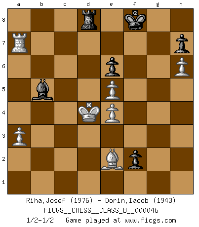 Last move : 1/2-1/2 2008 May 22 19:55:6 [Event "FICGS__CHESS__CLASS_B__000046"] [Site "FICGS"] [Date "2008.05.01"] [Round "1"] [White "Riha,Josef"] [Black "Dorin,Iacob"] [Result "1/2-1/2"] [WhiteElo "1976"] [BlackElo "1943"] 1.c4 Nf6 2.d4 e6 3.Nf3 b6 4.g3 Bb7 5.Bg2 Bb4+ 6.Bd2 Bxd2+ 7.Qxd2 O-O 8.Nc3 Ne4 9.Qd3 f5 10.Ne5 d5 11.O-O Nd7 12.Rad1 Nxe5 13.dxe5 c6 14.f3 Nxc3 15.Qxc3 Qe7 16.e3 Ba6 17.b3 dxc4 18.bxc4 Qc5 19.Rc1 Rad8 20.a3 f4 21.gxf4 Rxf4 22.Rfd1 Rxd1+ 23.Rxd1 Bxc4 24.Rd6 Rf7 25.f4 Rc7 26.h4 Kf7 27.Kf2 Bd5 28.Qxc5 bxc5 29.e4 Ba2 30.Ke3 Ke7 31.h5 g6 32.h6 Bc4 33.Bf3 Ba6 34.Bd1 Bc8 35.Bc2 Bd7 36.Rd1 Rb7 37.Kd3 Rb2 38.Kc3 Rb8 39.Kc4 Rf8 40.Rf1 Rb8 41.Kxc5 Rb2 42.Rc1 Rb5+ 43.Kc4 Rb2 44.Kc3 Rb8 45.Kd2 c5 46.Rb1 Rb6 47.Rb3 Kd8 48.Kc3 Bc8 49.Kc4 Rc6 50.Rd3+ Ke7 51.Rd6 Rc7 52.Bd1 Bd7 53.Bf3 Rc8 54.Ra6 Rf8 55.f5 gxf5 56.Rxa7 f4 57.Bd1 Rc8 58.Ba4 Rd8 59.Kxc5 f3 60.Kd4 f2 61.Bb5 Kf8 62.Be2 Bb5 1/2-1/2 English, 1...Nf6 (Anglo-Indian defense) Kingside Castling by player Black (move 7) Kingside Castling by player White (move 11) This chess game ended in a draw. Follow this game move after move (download)Let the perfectionist play postal. (Yasser Seirawan) Wenn Capablanka heute auf der Schachbühne erscheinen würde, hätte er ein halbes Jahr gebraucht um sich die Schachtheorie anzueignen. Und dann hätte er alles und jeden besiegt. (Mikhail Moiseyevich Botvinik) El Ajedrez es sobre todo, ¡una pelea!. (Emanuel Lasker) Roi des jeux et jeu des rois, les échecs portent en eux un sentiment d'infini. Ils donnent à celui qui s'est efforcé d'en approfondir les arcanes l'impression de n'être pas à la mesure de l'homme; en fait, ils constituent un résumé de l'univers, un microcosme, et figurent cette grande échelle qui, dans les plans de la lumière descend jusqu'à la matière, qui des abîmes insondables remonte jusqu'en l'infini de Dieu. (Pyrame) Beta. Software undergoes beta testing shortly before it's released. Beta is latin for still doesn't work. (Anonymous)