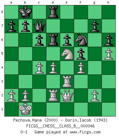 Last move : 0-1 2008 October 14 11:23:30 [Event "FICGS__CHESS__CLASS_B__000046"] [Site "FICGS"] [Date "2008.05.01"] [Round "1"] [White "Pechova,Hana"] [Black "Dorin,Iacob"] [Result "0-1"] [WhiteElo "2000"] [BlackElo "1943"] 1.e4 c6 2.d4 d5 3.Nc3 dxe4 4.Nxe4 Bf5 5.Ng3 Bg6 6.h4 h6 7.Nf3 Nd7 8.h5 Bh7 9.Bd3 Bxd3 10.Qxd3 Ngf6 11.Bf4 Qa5+ 12.Bd2 Qc7 13.O-O-O O-O-O 14.c4 e6 15.Kb1 Kb8 16.Ne4 Nc5 17.Nxc5 Bxc5 18.Rh4 Bd6 19.Qe2 Qe7 20.Bf4 Nd7 21.Rd3 Rhe8 22.Rg4 Bxf4 23.Rxf4 f6 24.Re4 f5 25.R4e3 Nf6 26.Ne5 Qc7 27.f4 Rd6 28.Rd2 Red8 0-1 This chess game has been lost on time (started : 2008.05.01 20:10:0) Caro-Kann : Classical, 7...Nd7 Queenside Castling by player White (move 13) Queenside Castling by player Black (move 13) Player Black won this chess game. Follow this game move after move (download)A strong memory, concentration, imagination, and a strong will is required to become a great Chess player. (Bobby Fischer) Vielleicht wirkt die Aura früherer Spieler glanzvoller als die der heutigen Spieler, aber das liegt daran, dass man kein Programm wie Fritz hatte, das einem all die Löcher in ihren Partien zeigt. (Vladimir Kramnik) Puntos débiles o agujeros en la posición de tu oponente deben de ser ocupados por piezas, no Peones. (Siegbert Tarrasch) La conception d'un plan est le processus par lequel un joueur exploite les avantages de sa position tout en s'efforçant d'en réduire au minimum les inconvénients. Afin de garantir le succès, un plan doit toujours se fonder sur un diagnostic objectif des particularités d'une position. La conception d'un plan est d'autant plus difficile que la position est équilibrée, et grandement facilitée lorsqu'il n'existe qu'un seul plan susceptible de répondre aux exigences de la position. (Harry Golombek) Don't anthropomorphize computers - they hate it. (Anonymous)