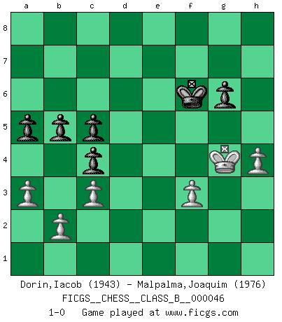 Last move : 1-0 2008 October 4 7:2:10 [Event "FICGS__CHESS__CLASS_B__000046"] [Site "FICGS"] [Date "2008.05.01"] [Round "1"] [White "Dorin,Iacob"] [Black "Malpalma,Joaquim"] [Result "1-0"] [WhiteElo "1943"] [BlackElo "1976"] 1.Nf3 Nf6 2.c4 e6 3.Nc3 Bb4 4.g3 O-O 5.Bg2 d5 6.a3 Bxc3 7.dxc3 Nbd7 8.cxd5 exd5 9.O-O Re8 10.Bf4 c6 11.Qc2 Nb6 12.Rad1 Ne4 13.Nd4 Bd7 14.f3 Nf6 15.e4 c5 16.Nf5 Bxf5 17.exf5 Nc4 18.Rfe1 Qb6 19.Bc1 h6 20.Bf1 Qc6 21.Kg2 Rxe1 22.Rxe1 Re8 23.Rxe8+ Qxe8 24.Qe2 Qa4 25.g4 b6 26.h4 Nh7 27.Qd3 Qb3 28.Be2 Ne5 29.Qd2 Nc4 30.Qd1 Qxd1 31.Bxd1 Nf6 32.Be2 Kf8 33.Kf2 Ke7 34.g5 hxg5 35.Bxc4 dxc4 36.Bxg5 g6 37.fxg6 fxg6 38.Kg3 Ke6 39.Bxf6 Kxf6 40.Kf4 a6 41.Kg4 b5 42.Kf4 a5 43.Kg4 1-0 Reti Opening Kingside Castling by player Black (move 4) Kingside Castling by player White (move 9) Player White won this chess game. Follow this game move after move (download)Whoever sees no other aim in the game than that of giving checkmate to one's opponent will never become a good Chess player. (Euwe) Ich liebe den Moment, wenn ich das Ego meines Gegenüber breche. (Robert James Fischer) El Ajedrez es de 30 a 40 por ciento psicología. Uno no cuenta con esto cuando se juega contra una computadora. No lo puedo confundir. (Judith Polgar) Vous m'avez demandé de vous exposer quel est le fondement de la prière. Je ne fais que préparer les pièces du jeu sur la table... Nous sera-t-il permis d'en adopter les règles et si nous les appliquons scrupuleusement nous ne tarderons pas à faire mat le Roi divin ! Il ne pourra échapper à nos mains. (Sainte Thérèse d'Avila, Chemin de perfection) Begin at the beginning and go on till you come to the end; then stop. (Lewis Carrol, Alice in Wonderland)