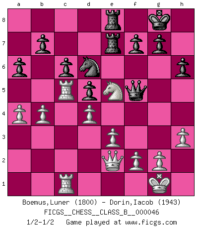 Last move : 1/2-1/2 2008 May 22 18:39:5 [Event "FICGS__CHESS__CLASS_B__000046"] [Site "FICGS"] [Date "2008.05.01"] [Round "1"] [White "Boemus,Luner"] [Black "Dorin,Iacob"] [Result "1/2-1/2"] [WhiteElo "1800"] [BlackElo "1943"] 1.Nf3 d5 2.d4 Nf6 3.c4 e6 4.Nc3 Bb4 5.cxd5 exd5 6.Bg5 O-O 7.Rc1 Nbd7 8.e3 h6 9.Bh4 c6 10.Bd3 Be7 11.O-O Ne4 12.Bxe7 Qxe7 13.Qc2 Re8 14.Rfe1 Ndf6 15.Ne5 Nxc3 16.Qxc3 Ng4 17.Nf3 Nf6 18.b4 Ne4 19.Qb3 a6 20.a4 Bf5 21.Rc2 Qe6 22.Rec1 Nd6 23.Bxf5 Qxf5 24.Ne5 Re6 25.h3 Rd8 26.Qc3 Ra8 27.Qd2 Rae8 28.Qe2 R6e7 29.Rc5 Re6 30.R5c2 R6e7 31.Rc5 1/2-1/2 Reti Opening Kingside Castling by player Black (move 6) Kingside Castling by player White (move 11) This chess game ended in a draw. Follow this game move after move (download)Chess is a terrible game. If you have no center, your opponent has a freer position. If you do have a center, then you really have something to worry about ! (Siegbert Tarrasch) Im Wettkampf zwischen starken Meistern kommen Fehler sehr selten vor, deshalb ist es mit bloßem Warten nicht getan. (José Raúl Capablanca) Tu sabes, camarada Pachman, no disfruto el ser un Ministro, preferería jugar al Ajedrez como tu. (Che Guevara) Des points faibles ou des trous dans la position de l'adversaire doivent être occupés par des pièces et non pas par des pions. (Siegbert Tarrasch) Memory is a way of holding onto the things you love, the things you are, the things you never want to lose. (from the television show: The Wonder Years)