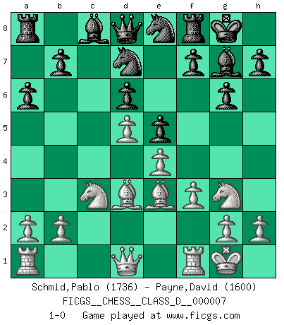 Last move : 1-0 2006 December 11 11:55:8 [Event "FICGS__CHESS__CLASS_D__000007"] [Site "FICGS"] [Date "2006.07.14"] [Round "1"] [White "Schmid,Pablo"] [Black "Payne,David"] [Result "1-0"] [WhiteElo "1736"] [BlackElo "1600"] 1.d4 Nf6 2.f3 g6 3.e4 Bg7 4.c4 d6 5.Nc3 O-O 6.Be3 e5 7.d5 c6 8.Bd3 Nbd7 9.Nge2 cxd5 10.cxd5 a6 11.O-O Ne8 12.Ng3 1-0 This chess game has been lost on time (started : 2006.07.14 18:32:41) Paleface attack Kingside Castling by player Black (move 5) Kingside Castling by player White (move 11) Player White won this chess game. Follow this game move after move (download)In blitz, the Knight is stronger than the Bishop. (Vlastimil Hort) Wer sich die Fähigkeit anerziehen will im Schach selbstständig zu denken, der muß alles meiden, was leblos ist: ausgeklügelte Theorien, die sich auf sehr wenige Beispiele und eine Menge Hirngespinste stützen. (Emanuel Lasker) A través de las casillas del tablero, los Indios explican el movimiento del tiempo y la edad, las influencias mas altas que controlan el mundo y los lazos que vinculan al Ajedrez con el alma humana. (Al-Masudi) Des idées, des idées, j'en ai cent, j'en ai mille. Des bonnes, des mauvaises, applicables, irréalisables... Il suffit de faire le tri ! (Roos) Plans are ideas that never come to fruition. (Daniel Parmet)