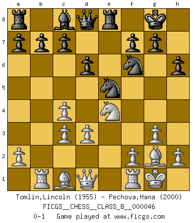 Last move : 0-1 2008 July 20 21:5:34 [Event "FICGS__CHESS__CLASS_B__000046"] [Site "FICGS"] [Date "2008.05.01"] [Round "1"] [White "Tomlin,Lincoln"] [Black "Pechova,Hana"] [Result "0-1"] [WhiteElo "1955"] [BlackElo "2000"] 1.c4 e5 2.Nc3 Nf6 3.Nf3 Nc6 4.g3 Bb4 5.Bg2 O-O 6.O-O e4 7.Ng5 Bxc3 8.bxc3 Re8 9.d3 exd3 10.exd3 d6 11.Rb1 h6 12.Ne4 Ne5 0-1 English Opening Kingside Castling by player Black (move 5) Kingside Castling by player White (move 6) Player Black won this chess game. Follow this game move after move (download)I feel as if I were a piece in a game of Chess, when my opponent says of it: That piece cannot be moved. (Soren Kierkegaard) Ich tröste mich mit dem Vergnügen, daß Schachfans, Zuschauer und Leser glücklich sind, wenn ein Großmeister etwas riskiert, statt nur Klötzchen zu schieben. (Mikhail Nekhemyevich Tal) a manera como él juega al Ajedrez, demuestra la completa naturaleza de un hombre. (Stanley Ellin) Le pion, dans sa simplicité, marche droit devant lui, mais lorsqu'il prend, il le fait obliquement? Ainsi l'homme, tant qu'il reste pauvre, marche dans la droiture et vit honnêtement, mais lorsqu'il recherche les honneurs, il flatte, se parjure et, par les voies obliques, cherche une position supérieure sur l'échiquier du monde. (Jean de Galles) That's absurd. I love it. (Gregory House, House M.D.)