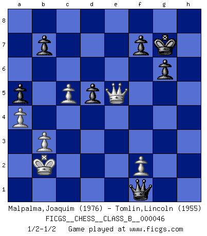 Last move : 1/2-1/2 2008 July 1 21:57:0 [Event "FICGS__CHESS__CLASS_B__000046"] [Site "FICGS"] [Date "2008.05.01"] [Round "1"] [White "Malpalma,Joaquim"] [Black "Tomlin,Lincoln"] [Result "1/2-1/2"] [WhiteElo "1976"] [BlackElo "1955"] 1.c4 c5 2.Nf3 Nc6 3.Nc3 Nf6 4.d4 cxd4 5.Nxd4 e6 6.g3 Be7 7.Bg2 Ne5 8.Qa4 O-O 9.Nf3 Nc6 10.O-O a6 11.Rd1 h6 12.Bf4 Bc5 13.Qc2 Qe7 14.Na4 e5 15.Nxc5 exf4 16.Nd3 fxg3 17.hxg3 d6 18.Nf4 Bg4 19.Nd4 Rac8 20.Nf5 Bxf5 21.Qxf5 Nb4 22.b3 Rc5 23.Qb1 Rg5 24.a3 Nc6 25.Ra2 h5 26.Qc1 Re8 27.Rad2 h4 28.gxh4 Rg4 29.Rd3 Rxh4 30.e3 Ne5 31.Rd4 Nfg4 32.Nh3 Rxh3 33.Bxh3 Qh4 34.Bxg4 Nxg4 35.Rxg4 Qxg4+ 36.Kf1 Qf3 37.Ke1 Re6 38.Qd2 Rh6 39.Qe2 Qf5 40.Kd2 Rh2 41.Rf1 g6 42.Kc1 d5 43.c5 a5 44.a4 Qf6 45.Qb2 Qg5 46.Qd2 Kh7 47.Kb2 Qg2 48.Qe1 Kh6 49.Qc3 Rh3 50.Qc1 Kg7 51.Qe1 Rxe3 52.Qxe3 Qxf1 53.Qe5+ Kh7 54.Qh2+ Kg7 55.Qe5+ Kh7 56.Qh2+ Kg7 57.Qe5+ 1/2-1/2 English : Symmetrical variation Kingside Castling by player Black (move 8) Kingside Castling by player White (move 10) This chess game ended in a draw. Follow this game move after move (download)A thorough understanding of the typical mating continuations makes the most complicated sacrificial combinations leading up to them not only not difficult, but almost a matter of course. (Siegbert Tarrasch) Ein Teil des Fehlers ist immer korrekt. (Savielly Grigorievitsch Tartakower) Si el Ajedrez es una ciencia, es la mas inexacta. Si el Ajedrez es un arte, es demasiado inexacto para ser visto como tal. Si el Ajedrez es un deporte, es demasiado esotérico. Si el Ajedrez es un juego, es demasiado exigente para ser solo un juego. Si el Ajedrez es una aventura, es una muy demandante. Si el Ajedrez es una pasión, es una muy gratificante. Si el Ajedrez es la vida, es una muy triste. (Anónimo) Donnez-moi un Cavalier en 6e et je gagnerais toutes mes parties. (Steinitz) There are more things in heaven and earth than practically anywhere else. (Unknown)