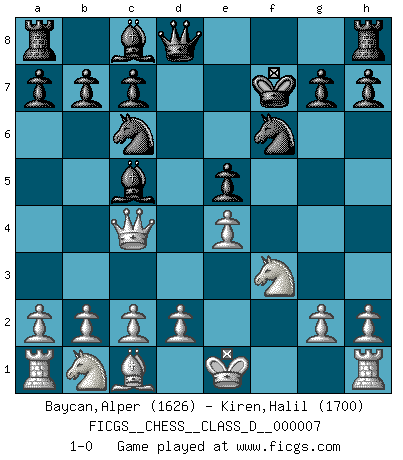 Last move : 1-0 2006 July 15 23:46:50 [Event "FICGS__CHESS__CLASS_D__000007"] [Site "FICGS"] [Date "2006.07.14"] [Round "1"] [White "Baycan,Alper"] [Black "Kiren,Halil"] [Result "1-0"] [WhiteElo "1626"] [BlackElo "1700"] 1.e4 e5 2.f4 Bc5 3.Nf3 d6 4.Bc4 Nf6 5.Qe2 Nc6 6.fxe5 dxe5 7.Bxf7+ Kxf7 8.Qc4+ 1-0 KGD : Classical variation Player White won this chess game. Follow this game move after move (download)I play correspondence chess because it is both art and science while chess is art only. (A player at FICGS) Wenn ich einen Club besuche, sind die Spieler stumm vor Staunen. (José Raúl Capablanca) Los libros de Ajedrez deben de usarse igual como usamos los anteojos: para mejorar la vista, aunque algunos jugadores los quieren usar como si ellos les otorgaran la vision. (José Raúl Capablanca) Ce qui est bien, c'est d'avoir tout un tas de pièces en prise : l'adversaire ne peut en prendre qu'une à la fois. Cité par Thierry Audin. Hello Thibault, if I have had a plan (and I had one, I hope), I have forgotten it during the last week... - Hello Heinz-Georg. What do you mean a plan ? (Anonymous players, during a Big Chess game)