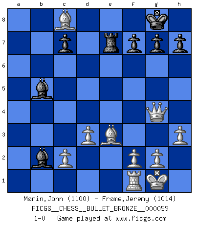 Last move : 1-0 2009 January 30 2:24:7 [Event "FICGS__CHESS__BULLET_BRONZE__000059"] [Site "FICGS"] [Date "2009.01.30"] [Round "1"] [White "Marin,John"] [Black "Frame,Jeremy"] [Result "1-0"] [WhiteElo "1100"] [BlackElo "1014"] 1.e4 e5 2.Nf3 Nc6 3.Bb5 a6 4.Ba4 b5 5.Bb3 d6 6.a4 Bb7 7.axb5 axb5 8.Rxa8 Qxa8 9.Nc3 Nf6 10.Nxb5 Qb8 11.d3 Be7 12.O-O Ba6 13.Nc3 O-O 14.h3 Rd8 15.Be3 d5 16.Nxd5 Nxd5 17.exd5 Nb4 18.Nxe5 Nxd5 19.Nc6 Qc8 20.Bxd5 Rd7 21.Qg4 Bf6 22.Be4 Bxb2 23.Bf5 Bb5 24.Ne7+ Rxe7 25.Bxc8 1-0 Ruy Lopez : Caro variation Kingside Castling by player White (move 12) Kingside Castling by player Black (move 13) Player White won this chess game. Follow this game move after move (download)Good offense and good defense both begin with good development. (Bruce A. Moon) Schach ist ein Kampf gegen den Fehler. (Johannes Herrman Zukertort) Todo se encuentra en un estado de flujo y esto incluye al mundo del Ajedrez. (Mikhail Botvinnik) Roi des jeux et jeu des rois, les échecs portent en eux un sentiment d'infini. Ils donnent à celui qui s'est efforcé d'en approfondir les arcanes l'impression de n'être pas à la mesure de l'homme; en fait, ils constituent un résumé de l'univers, un microcosme, et figurent cette grande échelle qui, dans les plans de la lumière descend jusqu'à la matière, qui des abîmes insondables remonte jusqu'en l'infini de Dieu. (Pyrame) You must have a dream in order to have it come true. (A.P.J. Kalam)