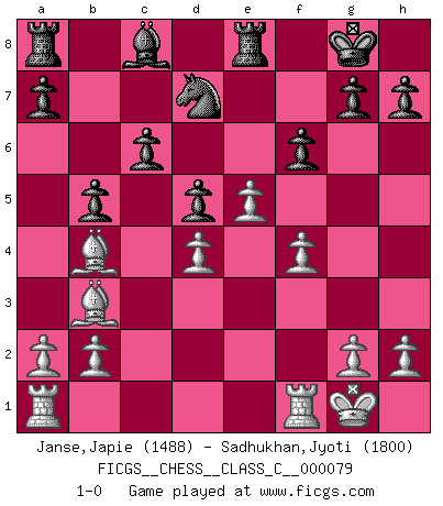 Last move : 1-0 2008 August 14 6:4:25 [Event "FICGS__CHESS__CLASS_C__000079"] [Site "FICGS"] [Date "2008.05.02"] [Round "1"] [White "Janse,Japie"] [Black "Sadhukhan,Jyoti"] [Result "1-0"] [WhiteElo "1488"] [BlackElo "1800"] 1.e4 e5 2.Nf3 Nf6 3.d4 exd4 4.e5 Qe7 5.Qe2 Nd5 6.Nxd4 Qb4+ 7.Qd2 Qxd2+ 8.Bxd2 Bc5 9.c3 O-O 10.Bc4 Bxd4 11.cxd4 Nb6 12.Bb3 c6 13.O-O d5 14.Nc3 N8d7 15.Na4 Re8 16.Bb4 Nxa4 17.Bxa4 b5 18.Bb3 f6 19.f4 1-0 This chess game has been lost on time (started : 2008.05.02 18:26:19) Petrov : Modern (Steinitz) attack Kingside Castling by player Black (move 9) Kingside Castling by player White (move 13) Player White won this chess game. Follow this game move after move (download)You know, comrade Pachman, I don't enjoy being a Minister, I would rather play Chess like you. (Che Guevara) Nach Morphy wurde nichts neues mehr in der Behandlung offener Positionen gefunden. (Mikhail Moiseyevich Botvinik) Aún el Rey más flojo huye despavorido ante la amenaza de un Jaque doble. (Aaron Nimzowitsch) Que feriez-vous si vous étiez en train de jouer aux échecs et que la fin du monde arrive ? Je continuerais à jouer. (Saint Borromée) It's only after you lost everything, Tyler says, that you're free to do anything. (Chuck Palahniuk, Fight Club)