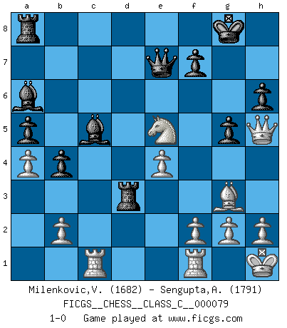 Last move : 1-0 2008 August 6 5:2:49 [Event "FICGS__CHESS__CLASS_C__000079"] [Site "FICGS"] [Date "2008.05.02"] [Round "1"] [White "Milenkovic,Vladimir"] [Black "Sengupta,Arnab"] [Result "1-0"] [WhiteElo "1682"] [BlackElo "1791"] 1.d4 d5 2.c4 e6 3.Nc3 c6 4.e3 Nf6 5.Nf3 Nbd7 6.Bd3 dxc4 7.Bxc4 b5 8.Bd3 a6 9.a4 b4 10.Ne4 c5 11.Nxf6+ Nxf6 12.O-O Bb7 13.dxc5 Bxc5 14.Qe2 O-O 15.e4 e5 16.Bg5 h6 17.Bh4 Qe7 18.Rac1 g5 19.Bg3 Nh5 20.Kh1 Rfd8 21.Nd2 a5 22.Qxh5 Rxd3 23.Nc4 Ba6 24.Nxe5 1-0 QGD : Semi-Slav Kingside Castling by player White (move 12) Kingside Castling by player Black (move 14) Player White won this chess game. Follow this game move after move (download)I am the best player in the world and I am here to prove it. (Bobby Fischer) Die Neutralität betrachte ich als eine schwere Krankheit. (Viktor Kortschnoi) El Ajedrez no es como la vida... ¡tiene reglas!. (Mark Pasternak) Le pion, dans sa simplicité, marche droit devant lui, mais lorsqu'il prend, il le fait obliquement? Ainsi l'homme, tant qu'il reste pauvre, marche dans la droiture et vit honnêtement, mais lorsqu'il recherche les honneurs, il flatte, se parjure et, par les voies obliques, cherche une position supérieure sur l'échiquier du monde. (Jean de Galles) I find your interest interesting. (Gregory House, House M.D.)