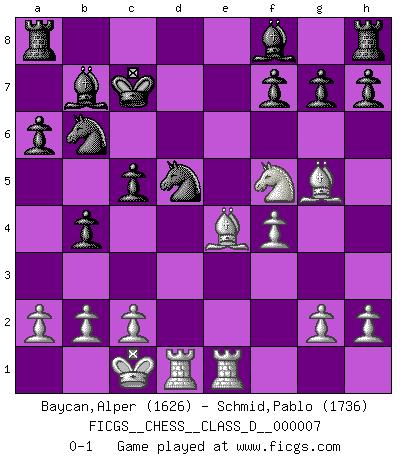 Last move : 0-1 2006 August 1 22:16:26 [Event "FICGS__CHESS__CLASS_D__000007"] [Site "FICGS"] [Date "2006.07.14"] [Round "1"] [White "Baycan,Alper"] [Black "Schmid,Pablo"] [Result "0-1"] [WhiteElo "1626"] [BlackElo "1736"] 1.e4 c5 2.Nf3 d6 3.d4 cxd4 4.Nxd4 Nf6 5.Nc3 a6 6.Bg5 e6 7.f4 Nbd7 8.Qf3 Qc7 9.O-O-O b5 10.Bd3 Bb7 11.Rhe1 Be7 12.Qg3 b4 13.Nd5 exd5 14.exd5 Kd8 15.Nf5 Bf8 16.Qe3 Qc5 17.Qe8+ Kc7 18.Qe3 Nxd5 19.Qxc5+ dxc5 20.Be4 N7b6 0-1 Sicilian : Najdorf, 7.f4 Queenside Castling by player White (move 9) Player Black won this chess game. Follow this game move after move (download)One bad move nullifies forty good ones. (Horowitz) Wenn du nicht weißt was du tun sollst, warte bis dein Gegner eine Idee hat. Sie wird sicher schlecht sein. (Siegbert Tarrasch) En la vida, como en el Ajedrez, los Peones propios obstruyen nuestro camino. La gran fortuna de un hombre, su comodidad, placer, hijos, libros, que deberían ayudarle a ganar, con mucha frecuencia lo ponen en Jaque Mate. (Charles Buxton) Les échecs, c'est la lutte contre l'erreur. (Johannes Zukertort) Life is like a game of cards: the hand you are dealt represents determinism; the way you play it is free will. (Jawaharlal Nehru)