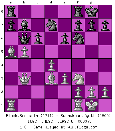 Last move : 1-0 2008 May 16 20:53:42 [Event "FICGS__CHESS__CLASS_C__000079"] [Site "FICGS"] [Date "2008.05.02"] [Round "1"] [White "Block,Benjamin"] [Black "Sadhukhan,Jyoti"] [Result "1-0"] [WhiteElo "1711"] [BlackElo "1800"] 1.Nf3 d5 2.d4 e6 3.c4 c6 4.Nbd2 Bb4 5.a3 Bxd2+ 6.Bxd2 dxc4 7.e3 b5 8.b3 cxb3 9.Qxb3 Bb7 10.Bd3 Nf6 11.O-O Nbd7 12.a4 O-O 13.axb5 Qb6 14.Ba5 1-0 Reti Opening Kingside Castling by player White (move 11) Kingside Castling by player Black (move 12) Player White won this chess game. Follow this game move after move (download)We like to think. (Gary Kasparov) Das Schach hält seine Meister in eigenen Banden, Fesseln; auf vielerlei Weise formt es ihren Geist, so dass die innere Freiheit selbst des Stärksten beeinflusst wird. (Albert Einstein) Un jugador que trata de regresar una movida en el Ajedrez es un futuro carterista. (Richard Fenton) Horreur, mais aussi harmonie suprême : qu'y avait-il en effet au monde en dehors des échecs ? Le brouillard, l'inconnu, le non-être... (Vladimir Nabokov) Perception is reality. (Immanuel Kant)