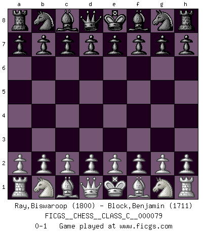 Last move : 0-1 2008 June 12 0:3:26 [Event "FICGS__CHESS__CLASS_C__000079"] [Site "FICGS"] [Date "2008.05.02"] [Round "1"] [White "Ray,Biswaroop"] [Black "Block,Benjamin"] [Result "0-1"] [WhiteElo "1800"] [BlackElo "1711"] 0-1 This chess game has been lost on time (started : 2008.05.02 18:26:19) Player Black won this chess game. Follow this game move after move (download)War is the child of passion, passion is the child of narcissism and narcissism is the child. (...) Another game ? (Thibault de Vassal) Obwohl ich alt bin, darf mir niemand den Finger in den Mund stecken, sonst beisse ich. (Wilhelm Steinitz) Aquel que toma al Peón de Caballo de la Reina, se pasará la noche a dormir en la calle. (Anónimo) Tous ces prétendus hommes politiques sont les pions, les Cavaliers, les Tours ou les Fous d'une partie d'échecs qui se jouera tant qu'un hasard ne renversera pas l'échiquier. (Honoré de Balzac) It is not titles that honor men, but men that honor titles. (Niccolo Machiavelli)