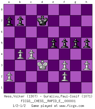 Last move : 1/2-1/2 2008 May 11 16:28:16 [Event "FICGS__CHESS__RAPID_E__000001"] [Site "FICGS"] [Date "2008.05.04"] [Round "1"] [White "Hess,Volker"] [Black "Guralivu,Paul-Iosif"] [Result "1/2-1/2"] [WhiteElo "1307"] [BlackElo "1071"] 1.e4 c5 2.Nf3 d6 3.d4 cxd4 4.Qxd4 Nc6 5.Bb5 Bd7 6.Bxc6 Bxc6 7.Bg5 Nf6 8.Nc3 e5 9.Qd2 Be7 10.O-O-O Nxe4 11.Bxe7 Qxe7 12.Nxe4 Bxe4 13.Qxd6 Qxd6 14.Rxd6 Bxf3 15.gxf3 Rd8 16.Rhd1 Rxd6 17.Rxd6 Ke7 18.Rd3 g5 19.Kd2 Rd8 20.Ke3 Rxd3+ 21.Kxd3 f5 22.c4 h5 23.h3 Kd7 24.b4 1/2-1/2 Comment by player 1 : Volker Hess : Then offer the drw ^^ Comment by player 2 : Paul-Iosif Guralivu : Let's draw. I don't think that any of us has a chance to win. Sicilian, Chekhover variation Queenside Castling by player White (move 10) This chess game ended in a draw. Follow this game move after move (download)The winner of the game is the player who makes the next-to-last mistake. (Savielly Tartakover) Es gibt keine einzige Frau, der ich nicht einen Springer vorgeben könnte und trotzdem gewänne. (Robert James Fischer) El Ajedrez es una hermosa aventura. (Bent Larsen) Même un GMI sait rarement calculer sur plus de cinq coups une attaque à sacrifices. (Rudolf Spielmann) No, no, you're not thinking; you're just being logical. (Niels Bohr)